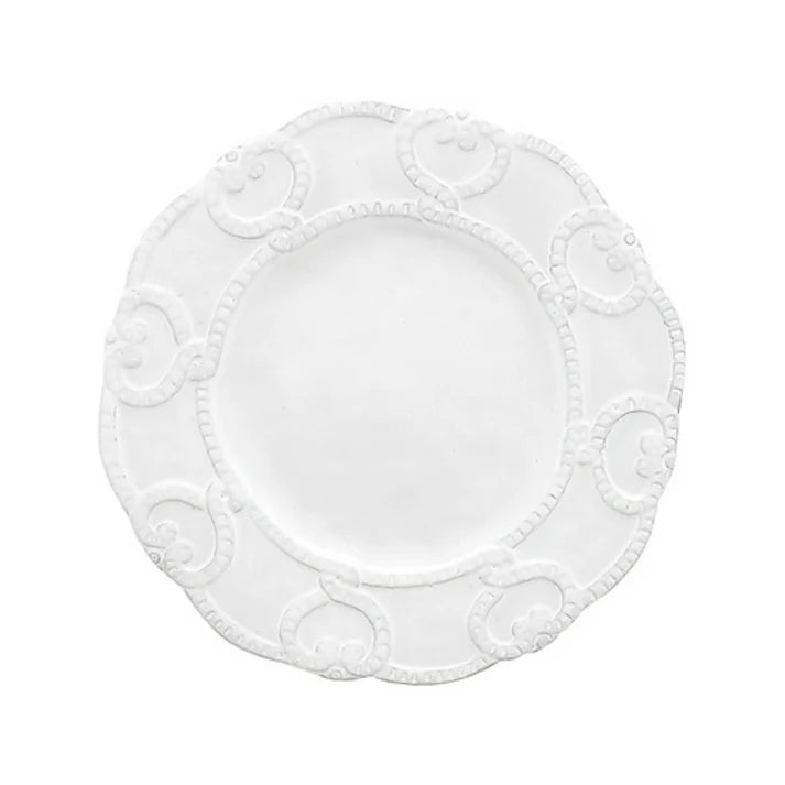The Bella Bianca Antique Lace Salad/Dessert Plate is a beloved piece in the Bella Bianca collection, admired for its exquisite design and practical functionality. Its handcrafted nature ensures each piece is unique, bringing a touch of Tuscan artistry to your table.