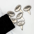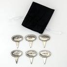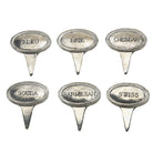 Elevate your cheese presentation with this elegant set of six cheese markers. Crafted from solid pewter, these markers are both durable and stylish. Each marker measures 2.5 inches in height, making them the perfect size to stand out on any cheese platter. They come packaged in a luxurious velvet bag, adding a touch of sophistication to the set. Impress your guests and add a touch of elegance to any cheese platter with this set of six cheese markers. Expertly designed to elevate your cheese presentation, this elegant set of six cheese markers is crafted from durable solid pewter. Each marker stands at 2.5 inches in height, making them the ideal size to set atop any cheese platter. Packaged in a luxurious velvet bag, these markers add a sophisticated touch to your spread, impressing your guests and adding an element of elegance to any occasion.