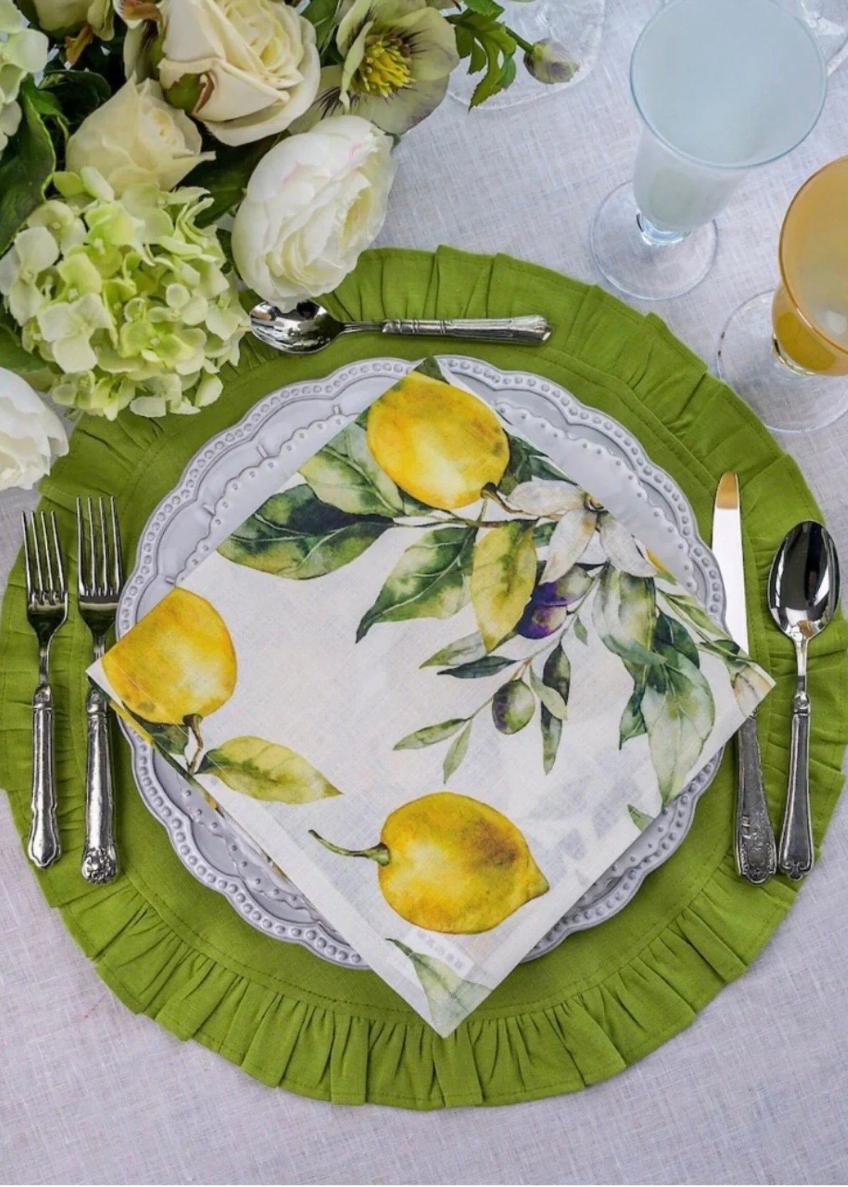 Discover refined dining elegance with the Arte Italica Round Ruffle Linen Placemats, where traditional Italian artistry meets effortless sophistication. Each placemat is carefully handcrafted from 100% pure linen, prized for its breathability, strength, and subtle sheen. The refined round shape combined with finely hand-stitched ruffled edges delivers a balanced blend of rustic charm and elegant simplicity. The natural, soft texture of linen creates a warm and inviting foundation for your table, while the ruffle detailing adds depth and grace, beautifully framing your dinnerware with a romantic touch. Perfect for casual brunches, garden lunches, or formal dinner occasions, these versatile placemats transition smoothly from everyday use to special celebrations.