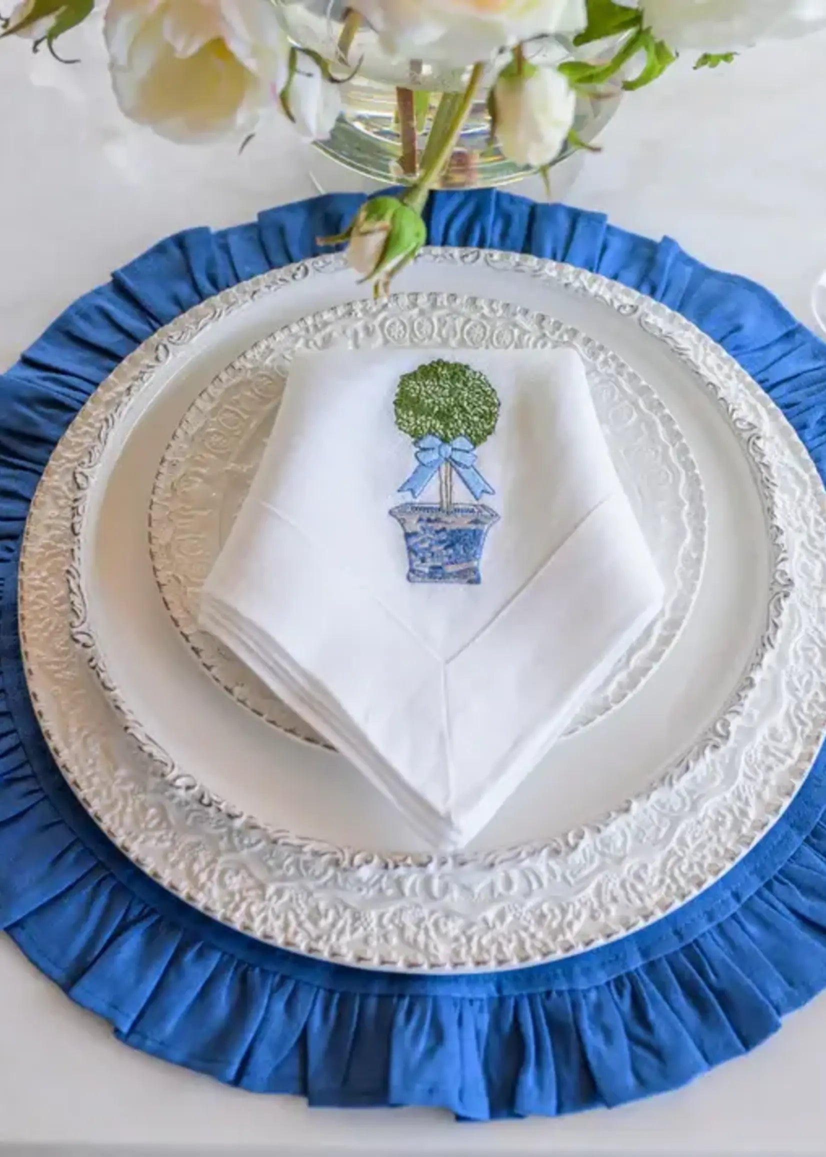Our Linen Placemats with a Round Ruffle Edge are exquisitely crafted from the finest quality linen, creating a statement piece for your table. Handmade by skilled artisans, the delicate ruffle edge and perfect round shape provide a luxurious backdrop for any occasion. These placemats are not only stunning but also practical, protecting your table from spills and stains. They make a thoughtful and cherished gift for those who appreciate the finer things in life.