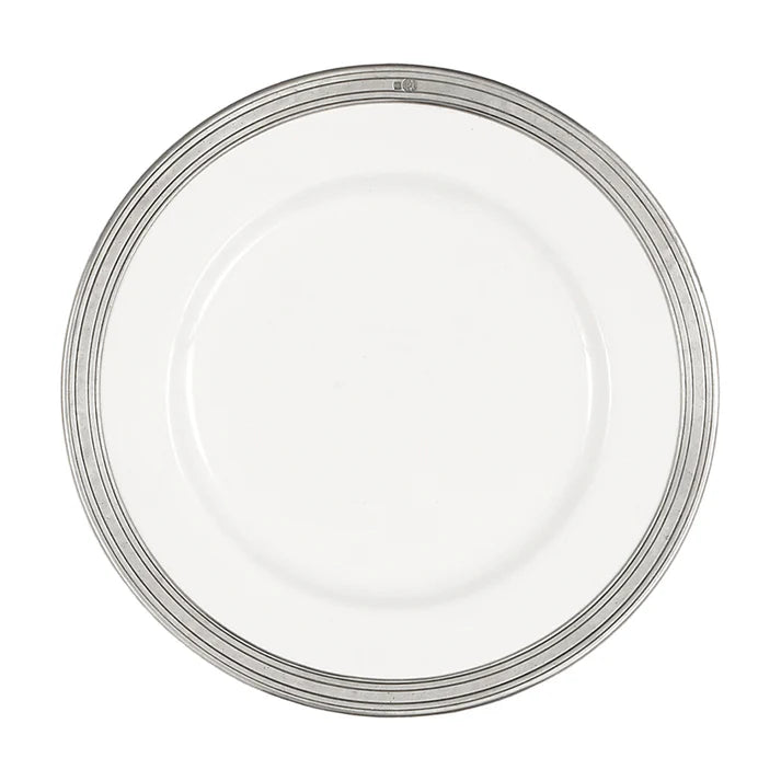 The blend of bianco white ceramic and hand-rubbed pewter creates a sophisticated and unique look. Each plate is meticulously handmade by skilled artisans in the province of Brescia, Italy, ensuring the highest quality and attention to detail. The classic yet contemporary design makes it a versatile addition to any dining setting, perfect for both everyday use and special occasions. Built to last, this plate is a beautiful piece that can be cherished and passed down through the family. With an 11-inch diameter, it provides ample space for a variety of culinary creations, making every meal a feast for the eyes.