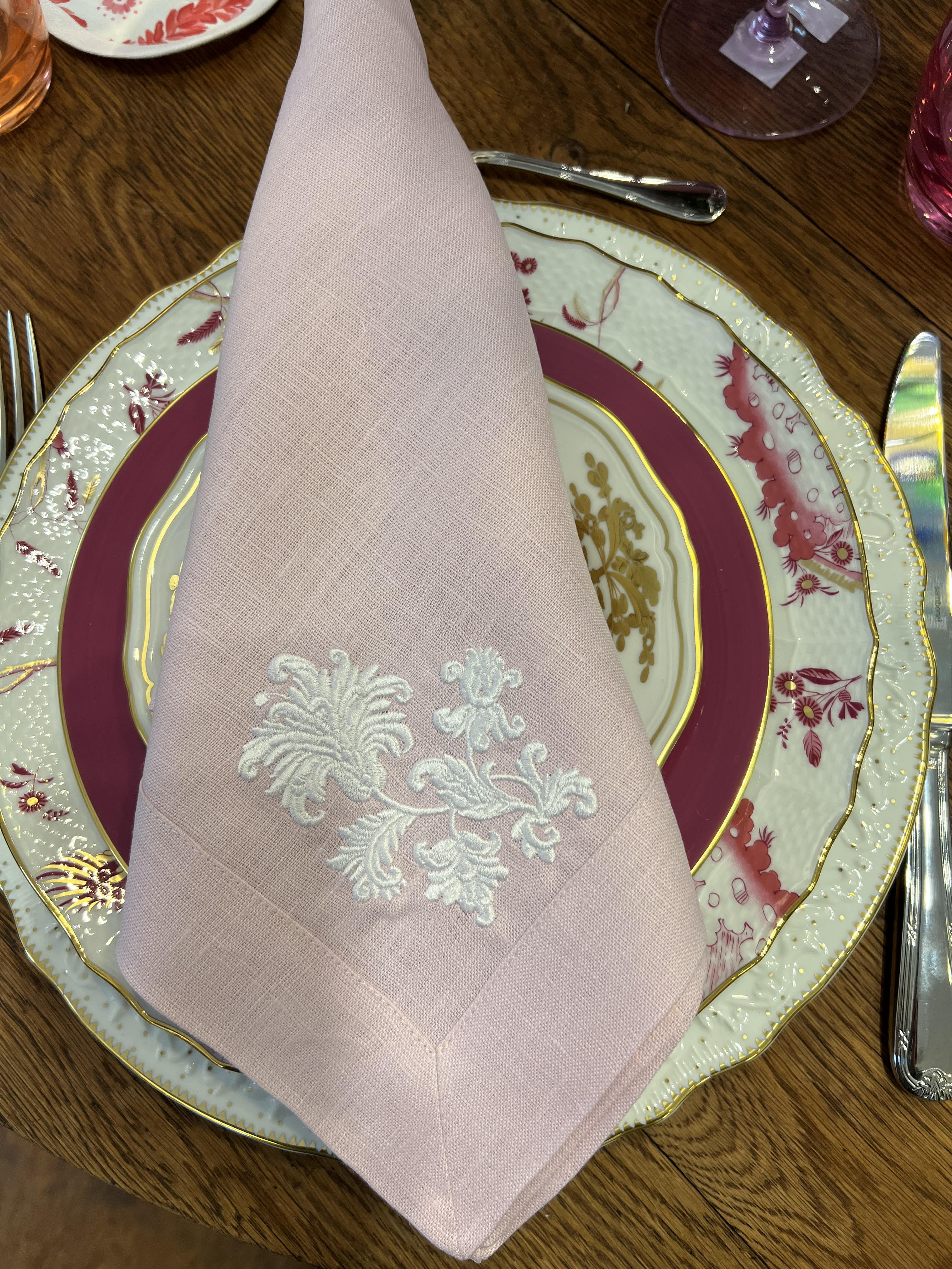 Enhance your dining experience with this exquisite 100% European linen napkin featuring our intricate Floral Bouquet embroidery. Achieve a pristine finish by gently washing and ironing it.