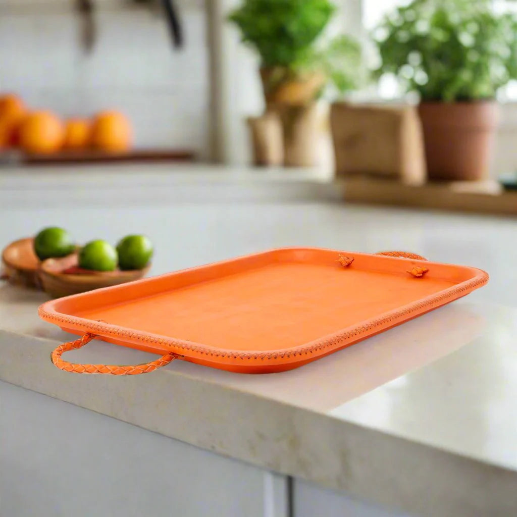 - LEATHER SERVING TRAY WITH BRAIDED HANDLES