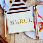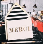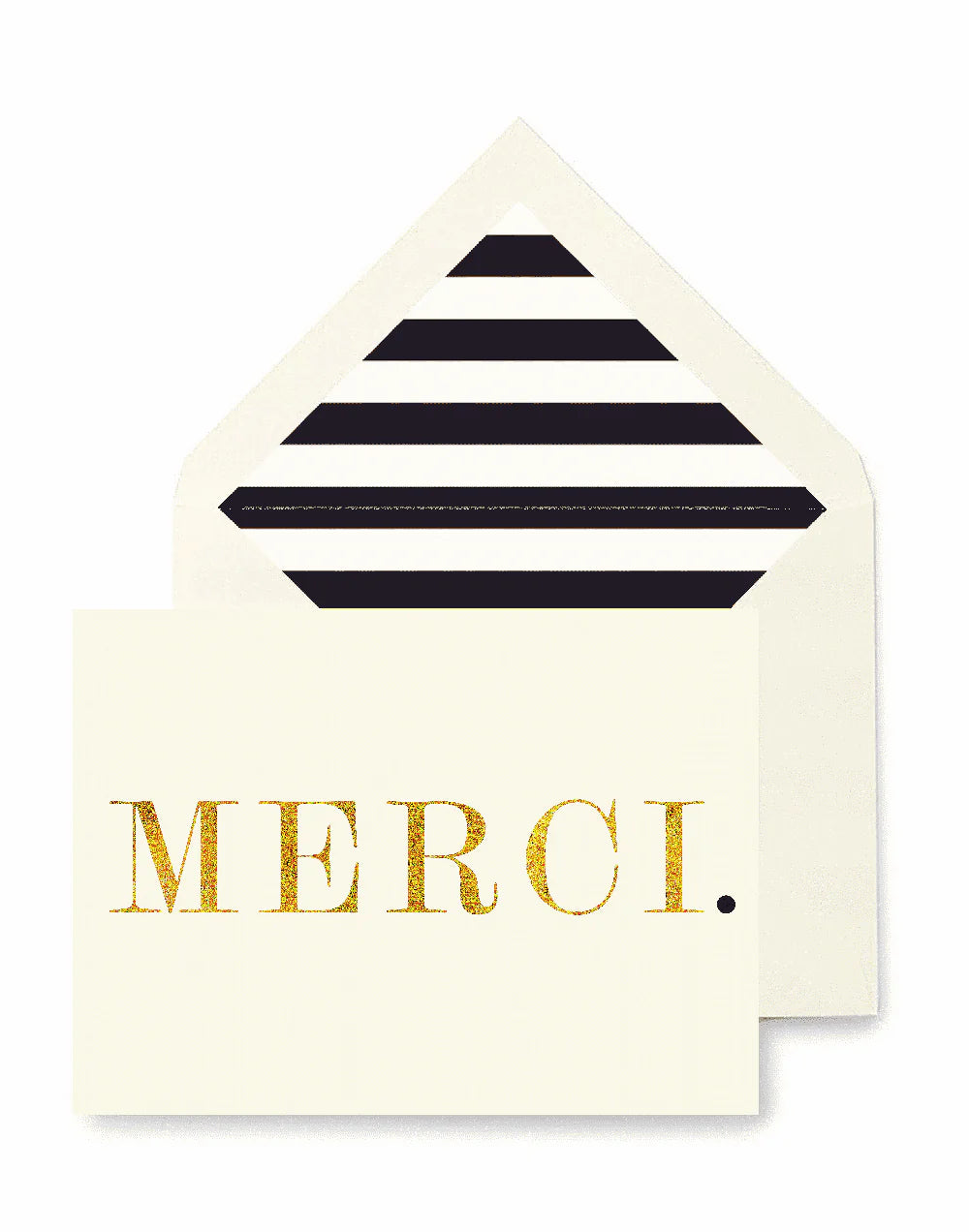 Greeting card features a design that includes shimmering gold foil and a striking black and white striped envelope lining. Available as a blank single card.