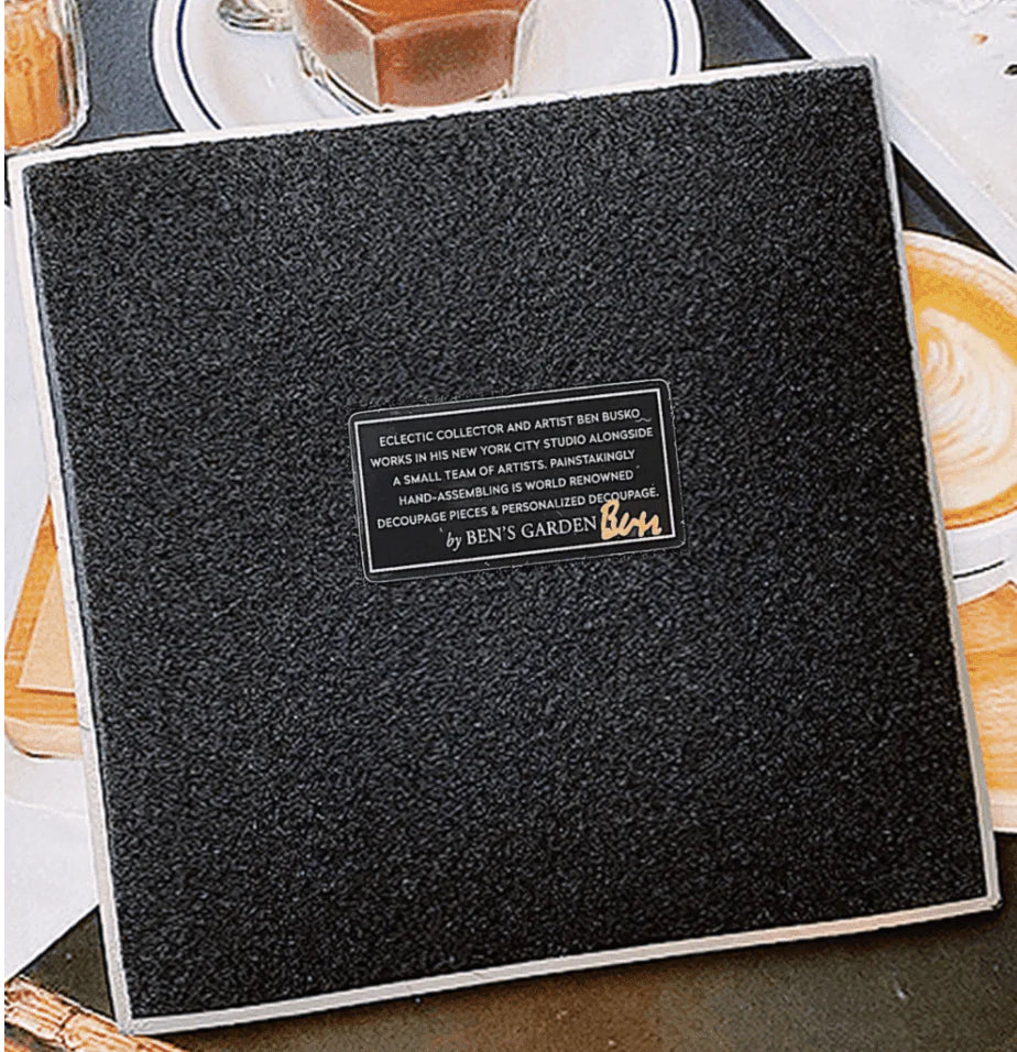Both practical and charming, Ben's signature glass decoupage is food safe, wipe clean and the back side is felted. Also suitable for hanging with a plate hanger and attractive standing on a gallery easel. A folded card explaining the time honored decoupage process accompanies each piece.
