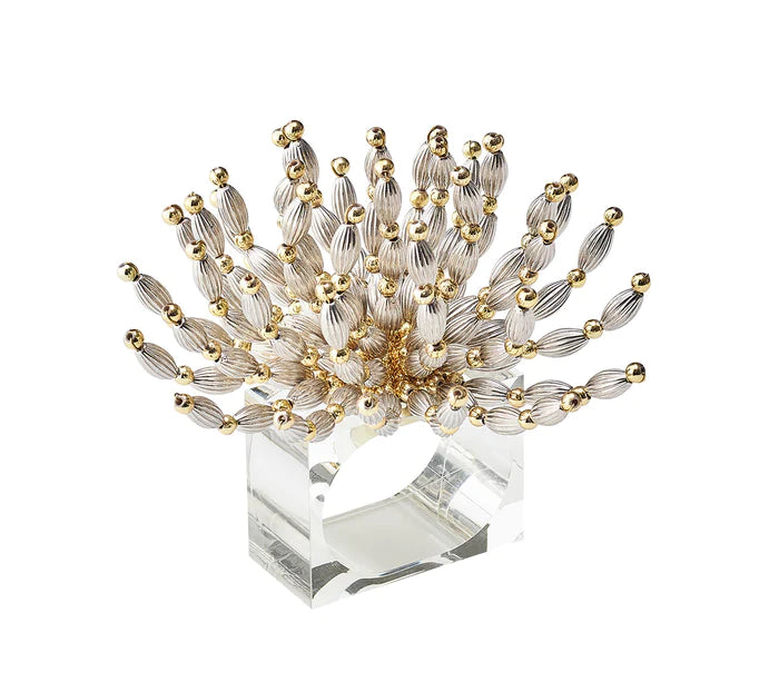 The Bead Burst Napkin Ring features textured beads finished with metallic caps. The beads are hand-arranged atop an acrylic base, mimicking an organic spray. This napkin ring will work well for either casual or elegant affairs, from al fresco parties to grand wedding celebrations.