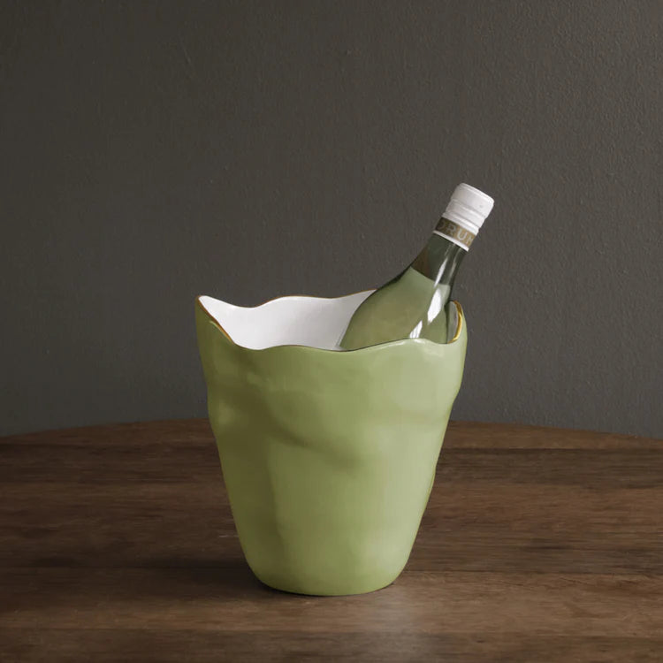 An essential ice bucket. The striking sculptural form of Beatriz Ball's ENCANTO Soho Large Ice Bucket (Green and Cream) is a perfect match for the lifestyle demands of today. Notable for its irregular form, and brilliant green and cream finish rimmed in gold, the ENCANTO Soho Large Ice Bucket (Green and Cream) is an awesome design that is as practical as it is decorative. Ideal for serving ice or chilling wine. Combine with other ENCANTO pieces for a sensational set. Fabulous gift items for brides, and perfect for anyone who loves to entertain. Beatriz Ball’s intensely handmade products use eco-friendly and sustainable materials and are crafted by artisans who trace a heritage of metalworking for generations. Made of a top quality, easy-care, aluminum alloy with an enamel finish. Dishwasher safe.