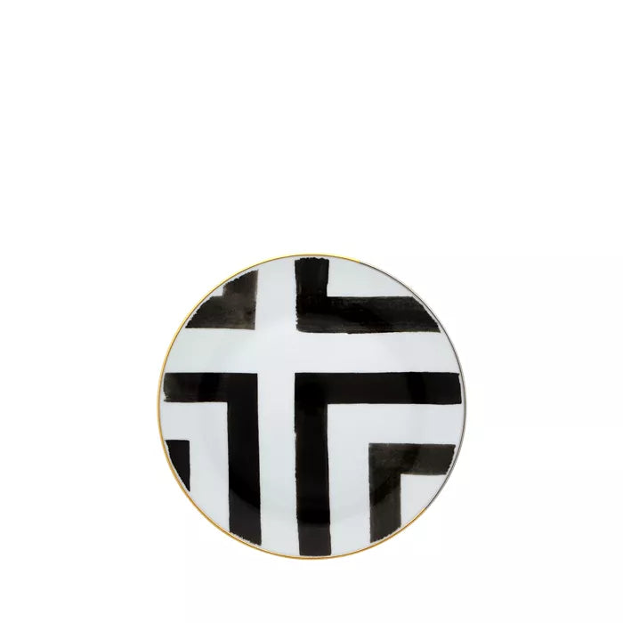 The Sol Y Sombra collection allows for bold mix-and-match styling, layering achromatic tones with metallic luxury to create a dining experience that feels as refined as it is expressive. Whether paired with the coordinating dinner and salad plates or used as a statement accent, this plate is a conversation starter.