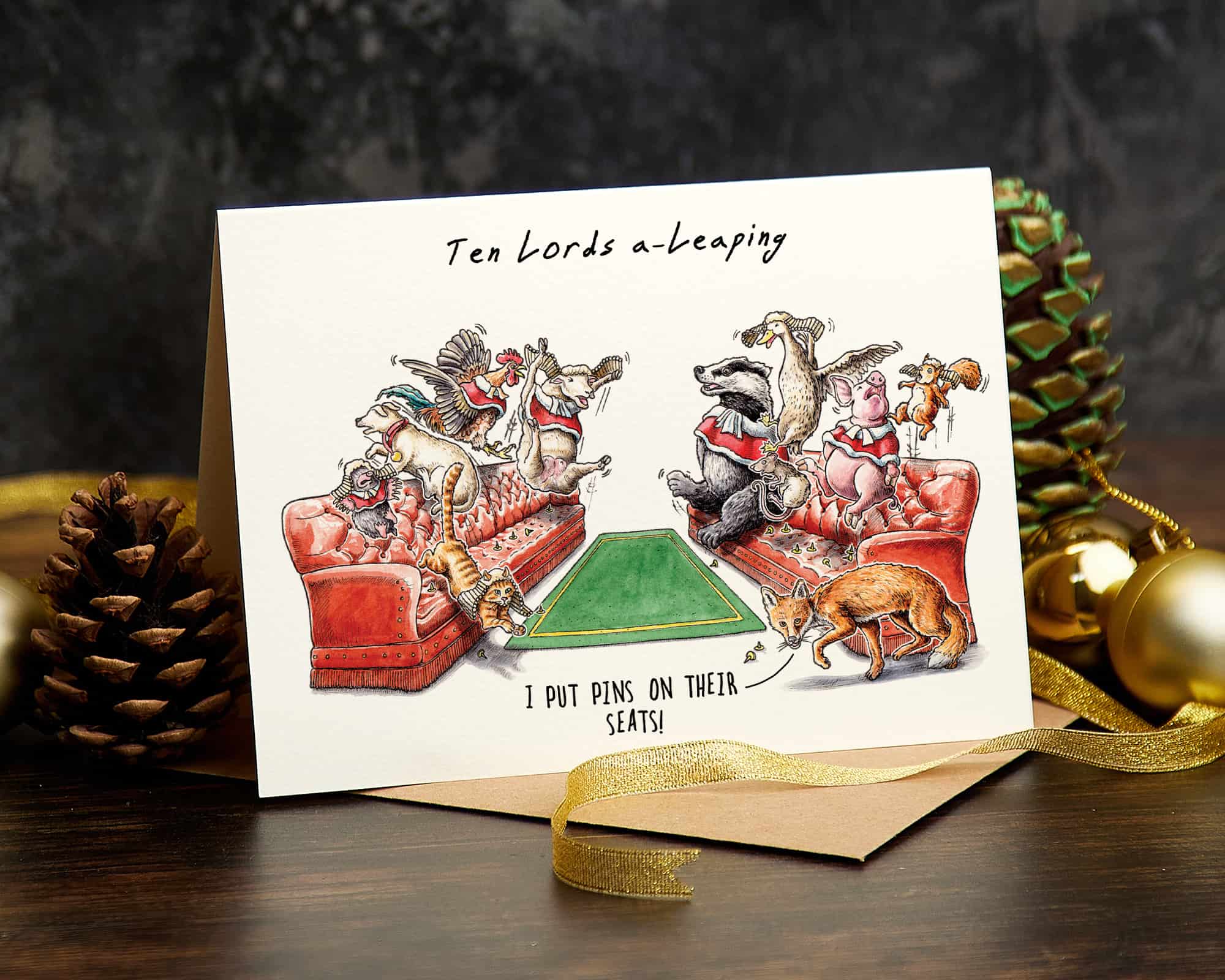 Send a guaranteed smile with Bewilderbeest's hilariously quirky "Ten Lords Leaping" card. Based in the UK, Bewilderbeest is renowned for its “Proudly Absurd” animal illustrations that blend humor and artistry. This card reimagines the classic holiday carol with a whimsical scene of ten lords mid-leap, adding a cheeky twist that’s perfect for light-hearted holiday greetings or any occasion that calls for a laugh.