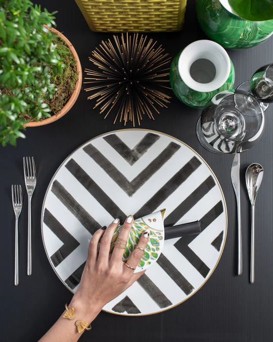 Indulge in the exquisite artistry of the Sol y Sombra Dinner Plate, a remarkable collaboration between Christian Lacroix Maison and Vista Alegre, brought to life under the prestigious Bordallo Pinheiro brand. This dinner plate transforms every dining experience into a celebration of color, light, and sophistication. Its striped watercolor design evokes the dynamic interplay of sun and shadow, while delicate hand-painted accents in 24k gold and platinum create a subtle shimmer that catches the eye and enhances the table with an air of refined elegance.