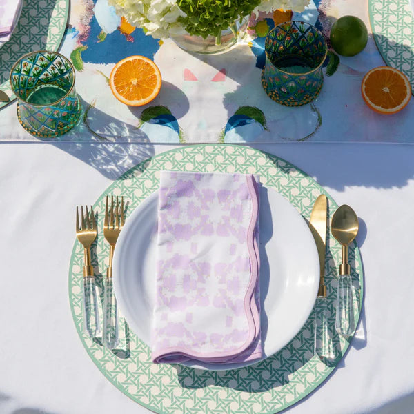 The Mosaic Lavender Scalloped Dinner Napkins by Laura Park offer an exquisite blend of timeless design and vibrant color. These napkins are the perfect addition to your dinner table, effortlessly combining classic elegance with a playful, contemporary twist. The soft lavender hue, paired with the intricate mosaic pattern, makes them an ideal choice for a variety of occasions, from formal gatherings to casual meals.