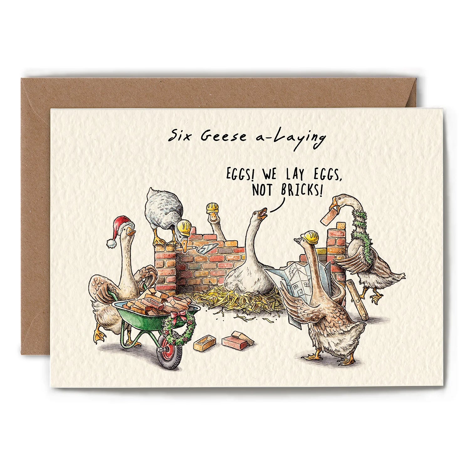 The "Six Geese Laying" card from Bewilderbeest blends quirky humor with artistic charm, making it an ideal choice for anyone who enjoys playful, offbeat greetings. Featuring a humorous twist on the classic "Twelve Days of Christmas" theme, the illustration showcases six geese in a hilarious, unexpected scenario, making it perfect for spreading joy during the holidays or any special occasion.