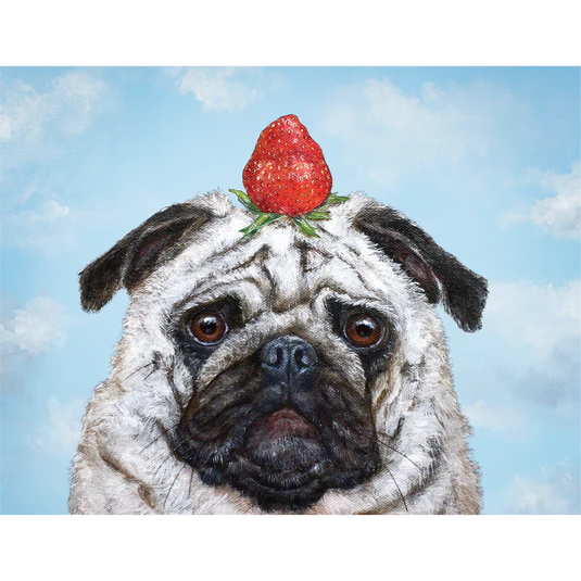 The Strawberry Pug greeting card by Vicki Sawyer captures the artist's signature whimsical style, blending nature and animals in a playful and imaginative way. The card features a cute pug adorned with a crown of strawberries and foliage, radiating charm and joy. Vicki Sawyer’s art is known for its ability to evoke a sense of wonder and delight, making this card a perfect choice for dog lovers, garden enthusiasts, or anyone who appreciates lighthearted and unique artwork.