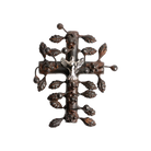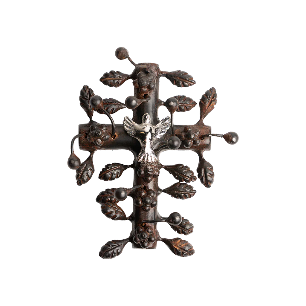 Hand rubbed wax cast and forged iron artisan cross with a nickel-plated small dove center . . . peace and love . . .