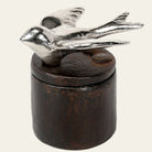 The Golondrina Box is a small, round cast iron box with a nickel plated swallow adorning the lid. The German-made of nickel plated golondrina, or swallow, sits atop a wax cast leather-lined box. In Mexican culture, golondrinas symbolize family and the important role of support and guidance. Just as the parents catch their young when they leave the nest, this box can hold onto precious moments and memories. Experience the meaningful connection between family and the beauty of nature with the Golondrina Box. Handcrafted by German artisans, this nickel plated swallow symbolizes guidance and support while providing a safe place for treasuring precious memories and keepsakes.