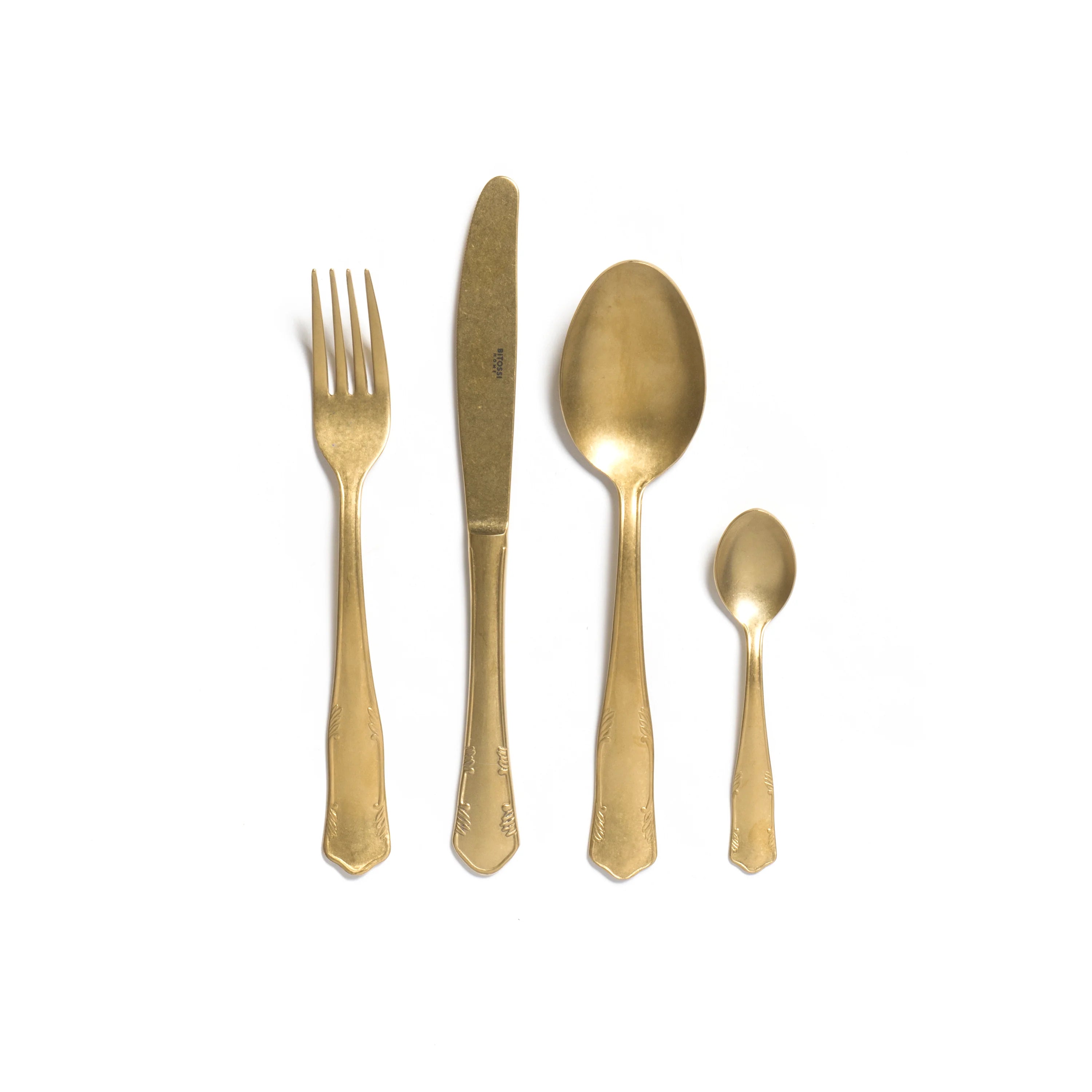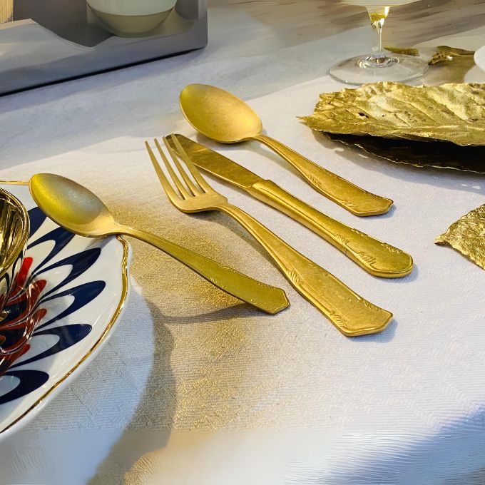 Elevate your dining experience with the Romantica Vintage Gold 4 Place Setting. This exquisite cutlery set is designed to bring a touch of sophistication and elegance to your table, making every meal a memorable occasion. Perfect for both everyday dining and special events, the Vintage Gold set combines timeless design with a contemporary matte finish. The vintage-inspired design of this cutlery set exudes classic elegance. The matte gold finish adds a modern twist, making it a versatile choice for various table settings, from casual lunches to formal dinners.