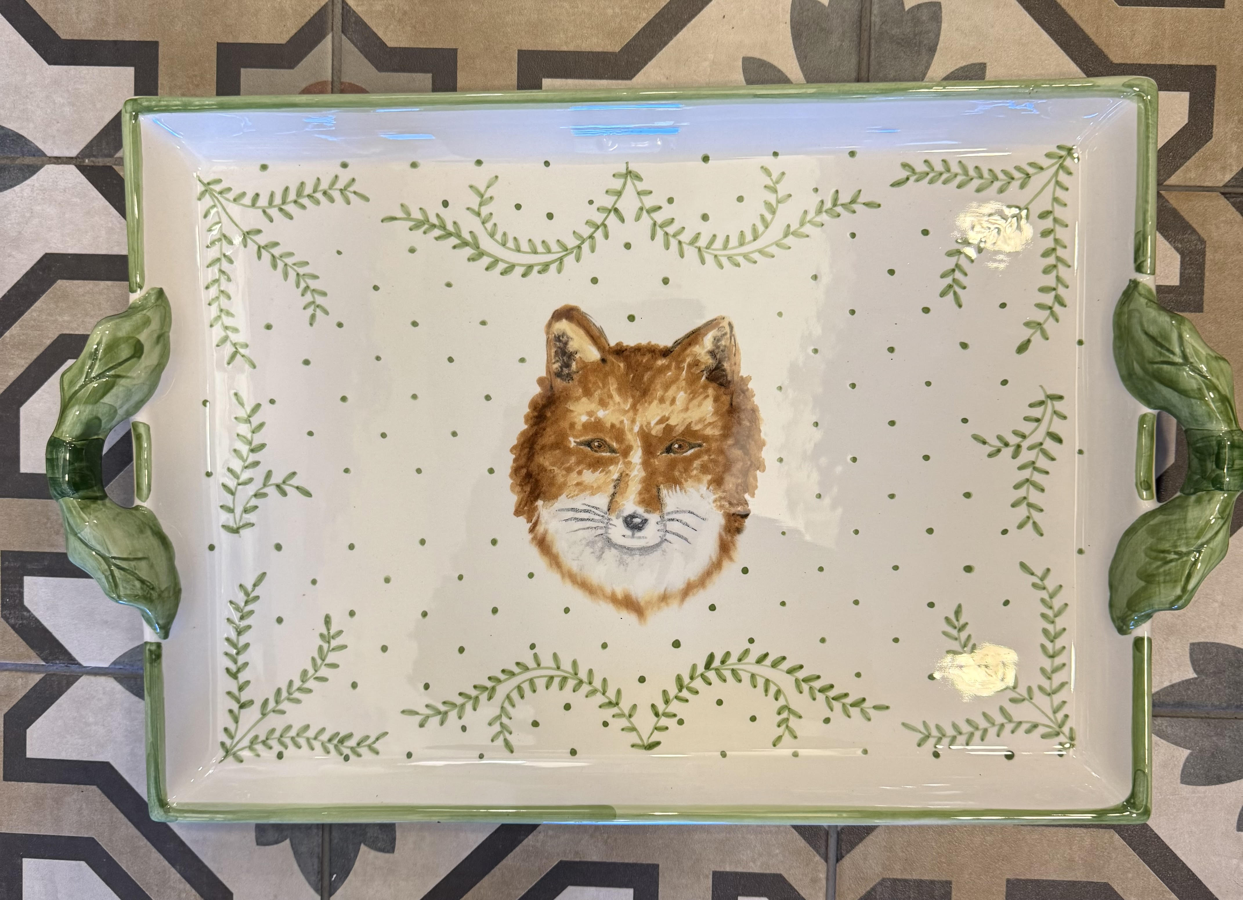 The Foxy Tray from CE Corey is a beautiful blend of functionality and artistry. Handcrafted and painted in Portugal, this tray features a charming depiction of a fox surrounded by soothing hues of  greens. Its beautiful design make it a standout piece, whether used for serving or displayed as décor.
