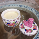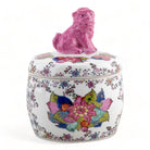 Soy wax filled candles in foo dog container. Pink foo dog lid and tobacco leaf pattern. Long burning hours. Reuse jar after finish burning. 100% natural soy wax. Lightly scent. Danny's exclusive design.