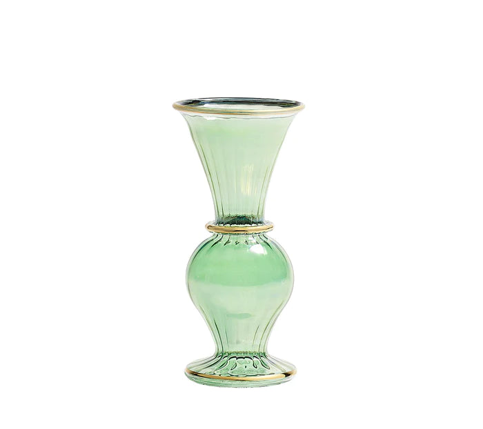 Crafted by skilled artisans, the Trumpet Bud Vase showcases an elongated trumpet-like design resting atop a spherical base, creating a striking silhouette that commands attention on any surface. The brilliant iridescent finish is the result of hand-applied color that is baked at high temperatures, producing a luminous quality that shifts and evolves with changing light. Elegant 18K gold bands adorn the rim, center, and base, adding refined sophistication and a modern twist on a classic vase form.