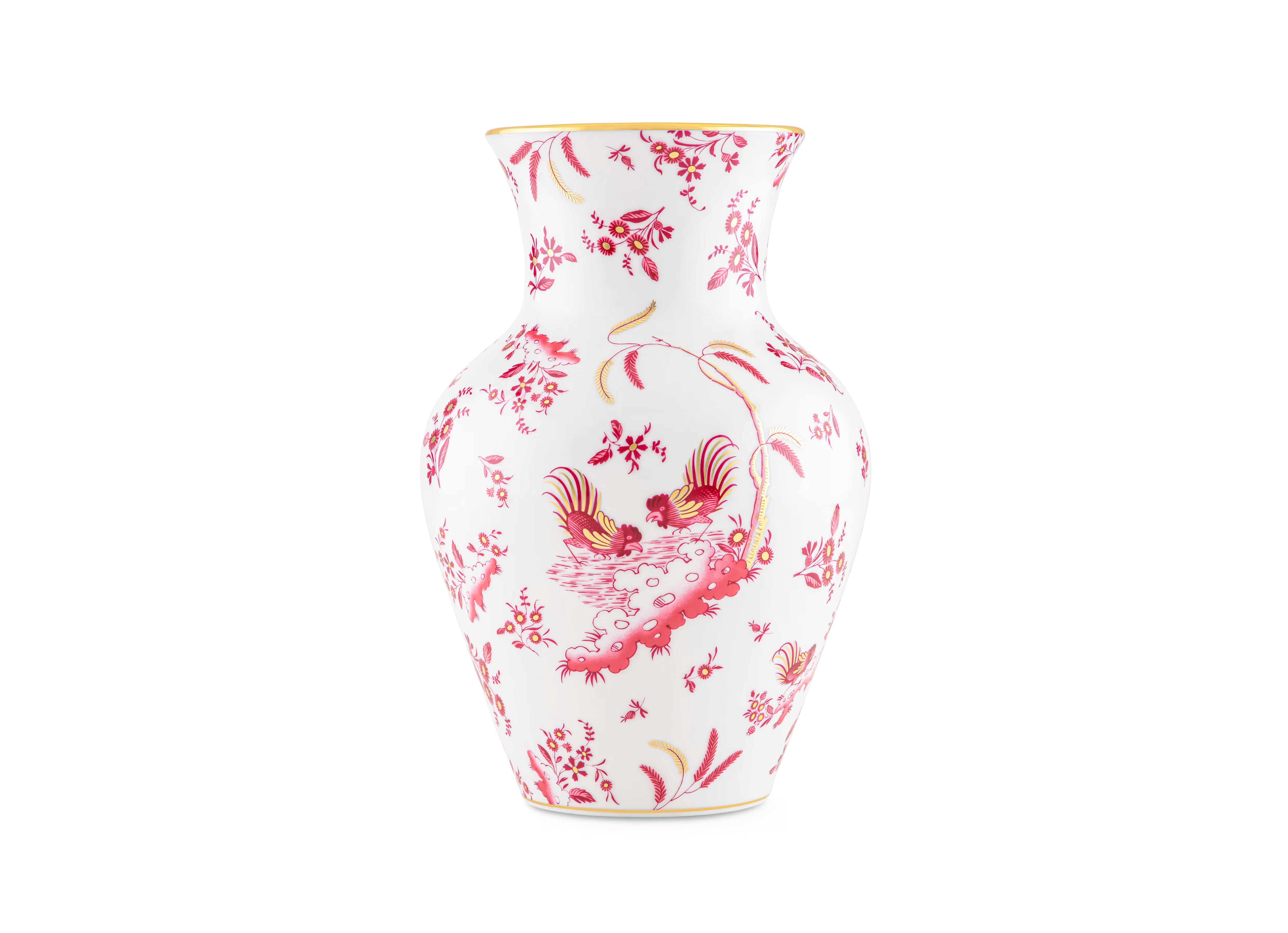 The Ji Ondori roosters are the central feature of the magenta-red decoration gracefully interwoven with exquisite hand decorated gold threading. A reflection of the Florentine Maison's savoir faire and artistry, the Ming vase combines the mastery of Italian artisanship with traditional Oriental styling for a collectible objet d'art. Oro di Doccia is available in complete table sets and other fine home accessories, including with turquoise and jade green decoration, and lends cachet and luxury to any occasion.