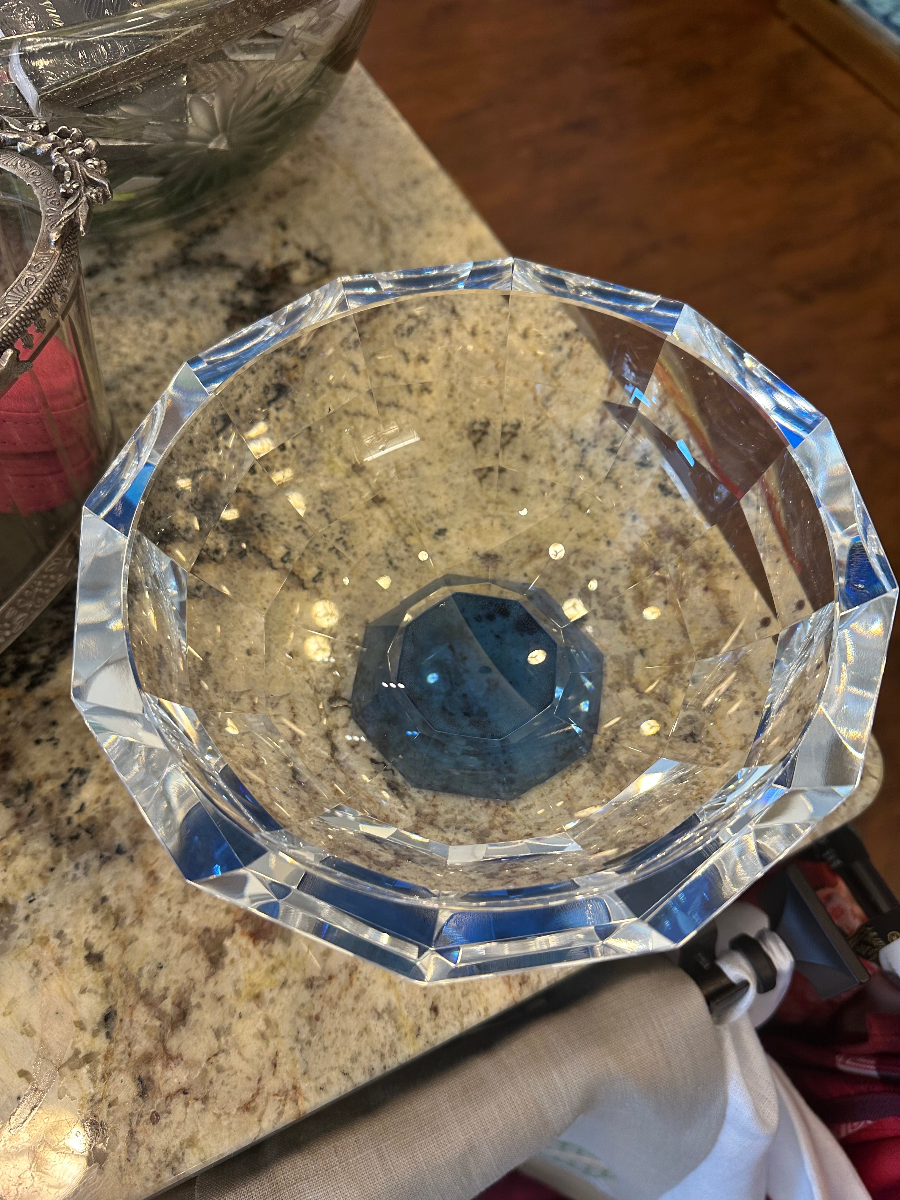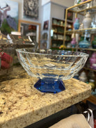 Beautiful clear crystal bowl on a blue base. 7" in circumference; 4" Tall