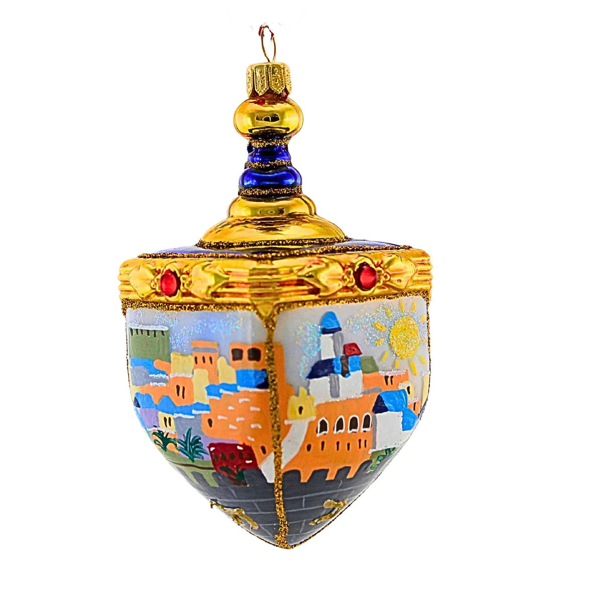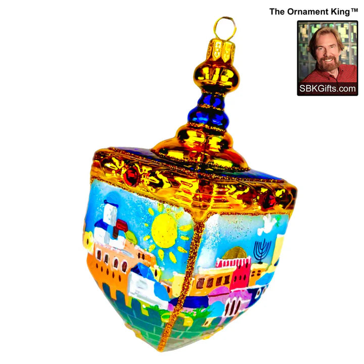 A celebration of faith, history, and exquisite craftsmanship, the Dreidel Deluxe Ornament from The Ornament King brings the timeless story of Jerusalem to life in shimmering European glass. Each ornament begins as molten glass, expertly mouth-blown by master artisans in Poland—a region renowned for generations of Old-World ornament making.