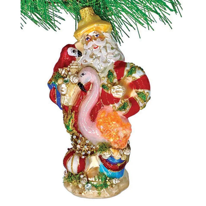 Experience the essence of Florida with the unique 6-inch Florida Fun Ornament—a must-have addition to any Christmas collection. This one-of-a-kind piece depicts Santa himself swapping his traditional sleigh for a tropical getaway, dressed in a stylish short-sleeved jacket and green swim trunks that capture the spirit of holiday relaxation in the Sunshine State. Surrounded by a vibrant array of carefully crafted Florida symbols, including a sparkling flamingo, colorful parrot, and playful swimming ring, this ornament celebrates the perfect blend of festive tradition and coastal charm.