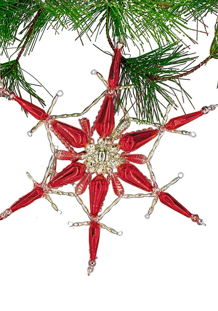 The Razke Dazzler Ornament represents the pinnacle of holiday craftsmanship, showcasing traditional Czech beadwork techniques refined over generations. This striking red star ornament combines stellar design with exceptional artisanal quality, featuring hand-applied beads that create a luminous, multidimensional surface. Each bead is precisely positioned to maximize light reflection, producing a captivating sparkle that commands attention on any tree or display.