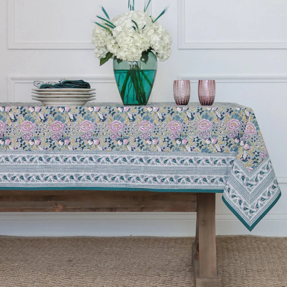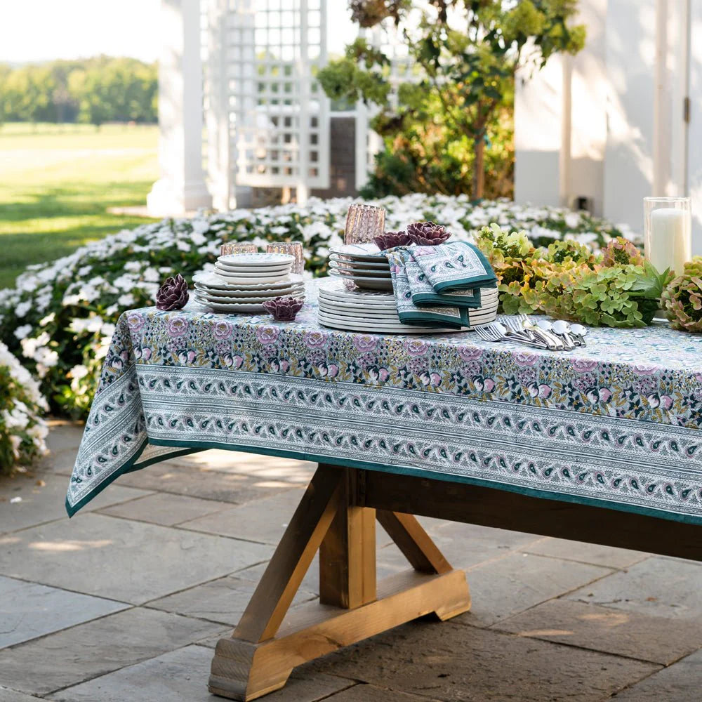 Bring a breath of fresh air to your table with the Garden Teal & Lilac Tablecloth, a hand-block printed masterpiece that blends timeless craftsmanship with serene botanical beauty. Designed by Pomegranate and made in India by skilled artisans, this tablecloth captures the elegance of traditional textile techniques while offering the ease of modern living.