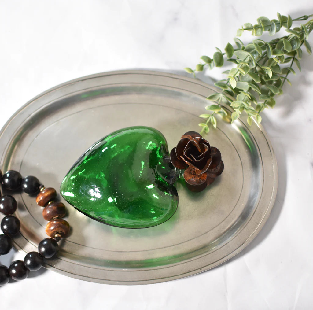 Corazon d'Melon Mouth blown sumptuous Chocolate glass heart with an iron rose . . . add to a place setting for a dinner for two . . . a symbol of the sweetness of love . . . Rojo Mouthblown glass heart the color of passion . . . finished with a perfectly crafted iron rose. Platinum Mouth blown puffed glass heart with platinum finish and tiny iron rose. Verde passion Mouthblown glass heart with tiny rose.