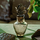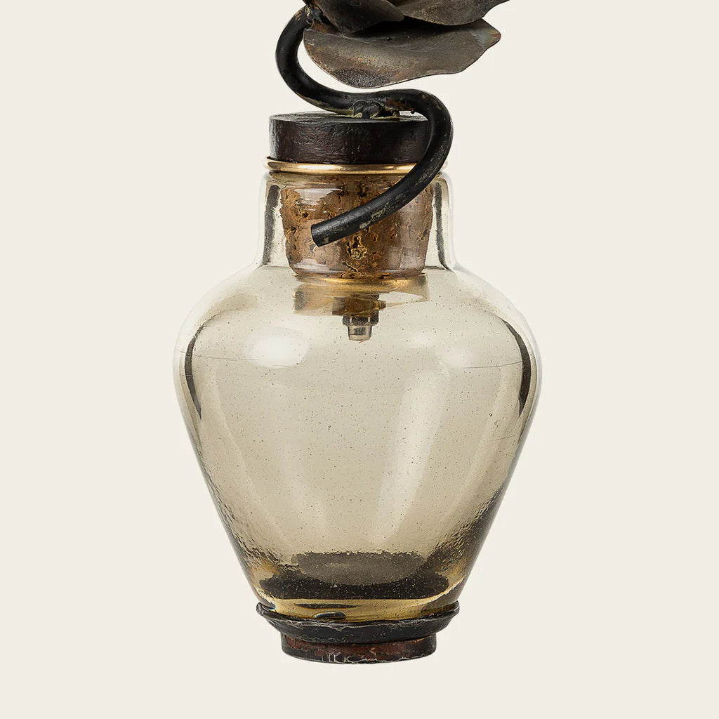 The vessel rests on a solid iron base that ensures stability and complements the glass’s delicate appearance with its robust and understated design. This contrast enhances the overall aesthetic, creating a striking visual impact.