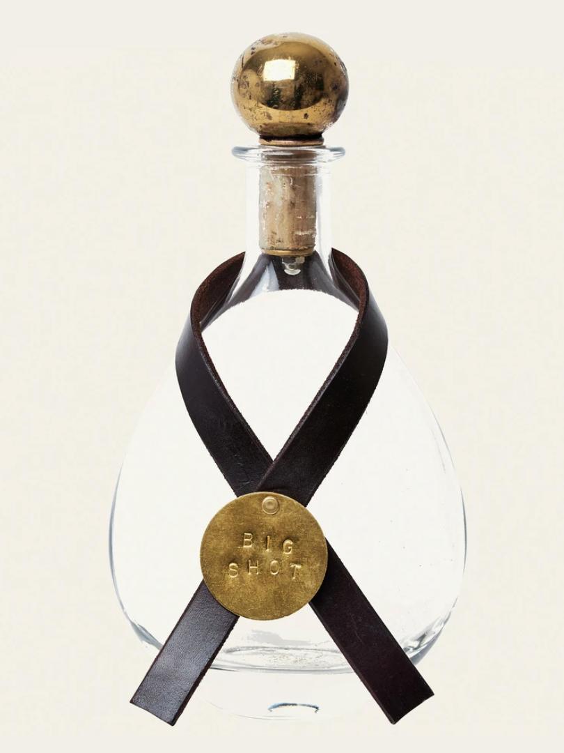 The pinnacle of luxury lies in the details, and the Big Shot Decanter doesn't disappoint. Its commanding presence is accentuated by a lavish 2" wax cast ball topper, ensuring each pour is a celebration in itself. The decanter is adorned with a meticulously crafted belt made of sumptuous chocolate leather, riveted to perfection. The pièce de résistance is the solid 2" brass seal, boldly embossed with the words "big shot," serving as a testament to the exceptional quality within.