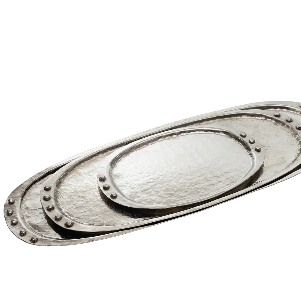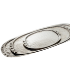 Ovalarga Nickel Oval Tray-Nickel Tray 26" long nickel plated oval tray with subtle hammered texture rest atop your bar, bookshelf or on the bathroom counter nest all three sizes practical beauty Bring an air of sophistication and practical beauty with Ovalarga. This 26" long nickel plated tray boasts a sleek, subtle hammered texture. Ideal for displaying on your bar, bookshelf, or bathroom counter. Elevate the atmosphere with a touch of sophistication. Ovalarga's 26" long nickel plated tray features a sleek, subtle hammered texture that adds practical beauty to your space. Perfect for display on your bar, bookshelf, or bathroom counter.- Ovalarga Nickel Plated Oval Tray
