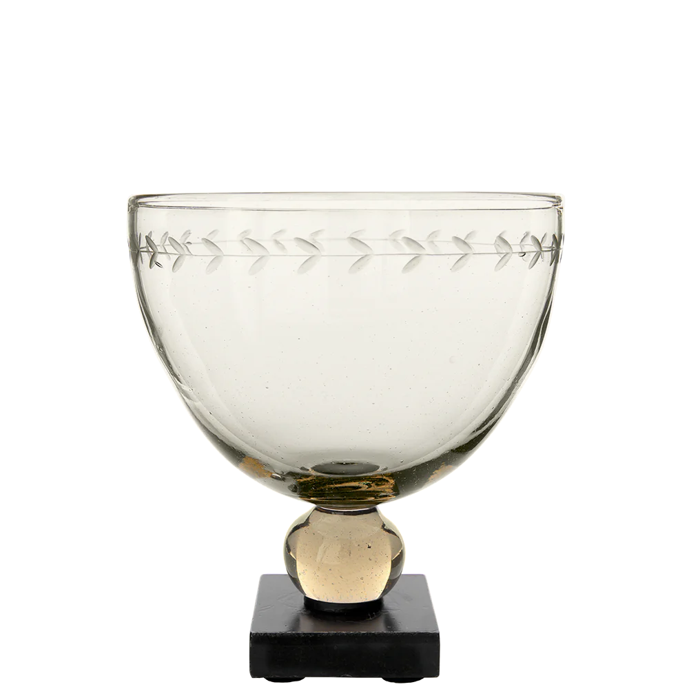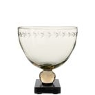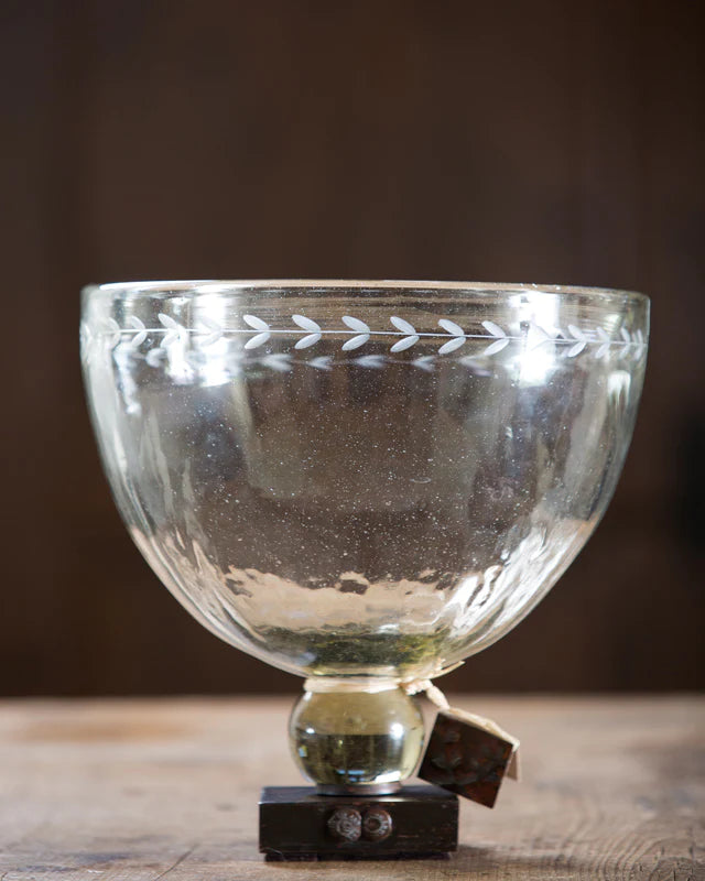 Elevate your living space with the 'Clarity, Small' bowl, an exquisite blend of art and functionality. This stunning piece is handcrafted by skilled artisans, showcasing a mouth-blown glass bowl that captures light beautifully, creating a mesmerizing play of reflections. The bowl is adorned with a hand-engraved laurel pattern, symbolizing victory and honor, adding a layer of sophistication and meaning to its design.