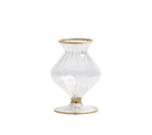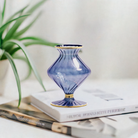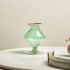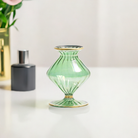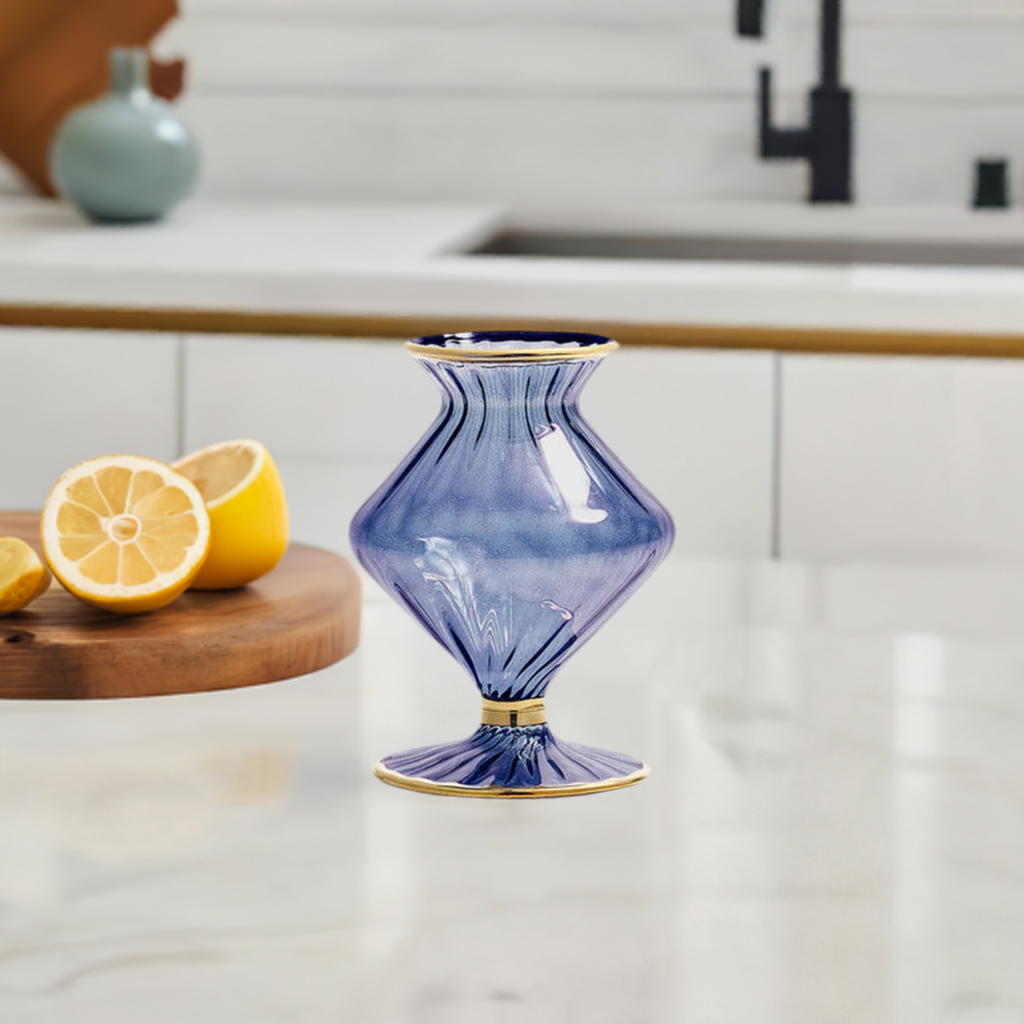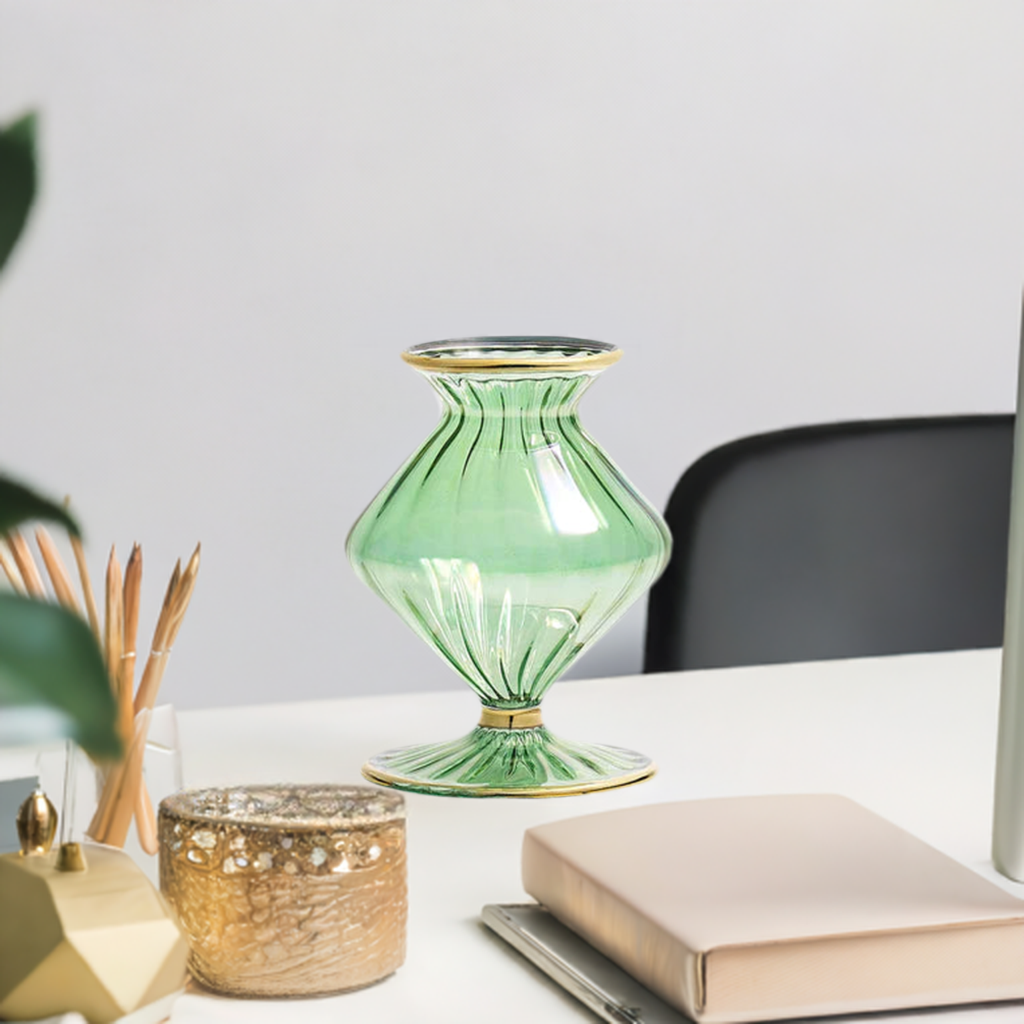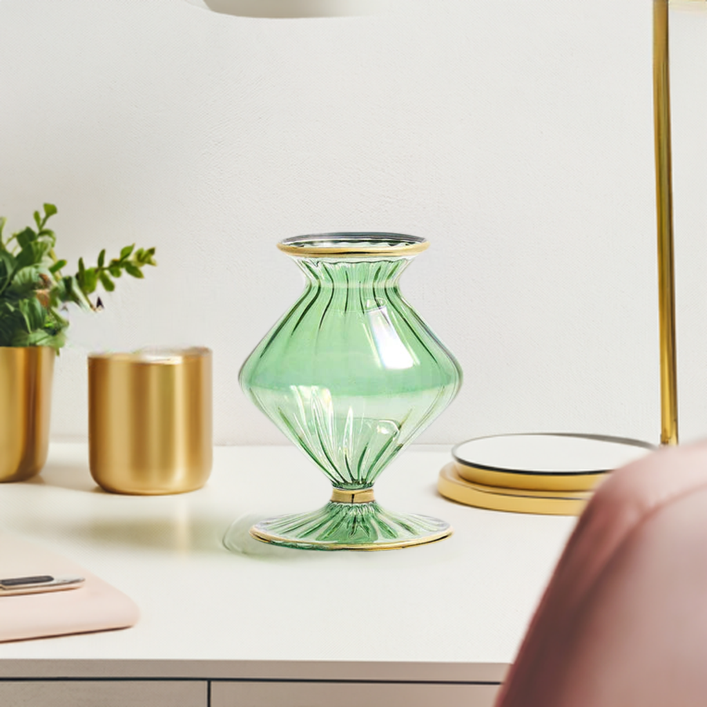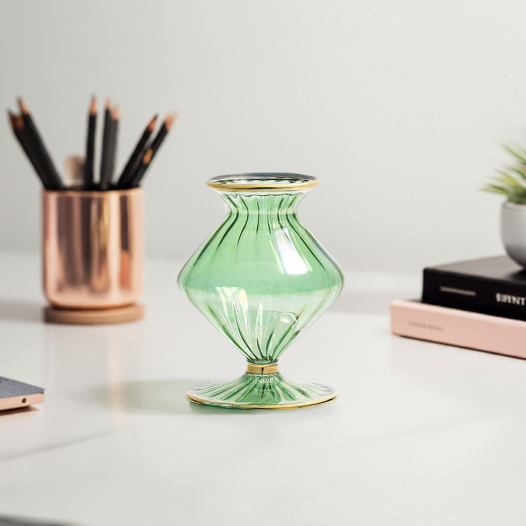 The mouth-blown glass Scallop Bud Vase is produced by hand-molding, and applying the color, then baking at high temperatures, resulting in its gorgeous iridescent luster. 18K gold bands accent the rim and base of the stylish diamond-shaped vase. Expect shape, size and color variation due to their hand-crafted nature.