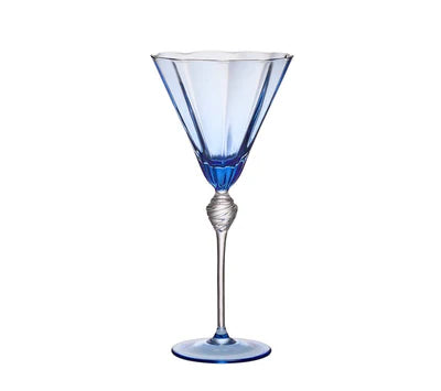 The regal Daphne Wine Glass is mouth-blown and features an intricate knot detail and a rich blue color. The optic detailing of the vibrant blue tapered bowl creates an elegant design. A clear hand-created glass knot sits atop the stem and creates a stunning contrast.