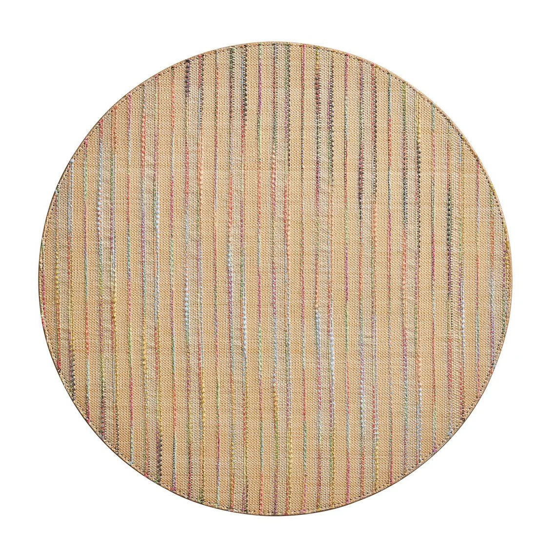 The round Frolic Placemat combines stunning vibrant design with entertaining ease. The round, woven placemat features a linear pattern with pops of festive colors. Created using vinyl that mimics the look of multi-colored yarn gives this versatile round placemat the texture and depth of a raffia-like fabric with the ease of cleaning.