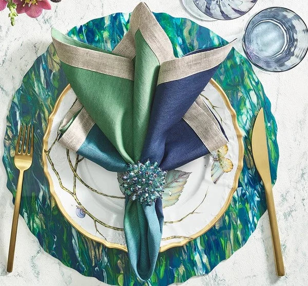 The Zinnia Napkin Ring by Kim Seybert showcases meticulous craftsmanship with shimmering blue and green beads artfully arranged to evoke the layered petals of a blooming flower. Each ring rests on a square clear acrylic base that provides visual lightness while anchoring the piece with architectural precision. The interplay of cool tones creates a sophisticated chromatic effect that complements both traditional and contemporary table settings. Ideal for special occasions or everyday entertaining, this napkin ring transforms a functional element into a statement accessory. The transparent base allows the beadwork to remain the focal point while maintaining an elegant, uncluttered aesthetic. Perfect for collectors of luxury tableware who appreciate thoughtful design details.