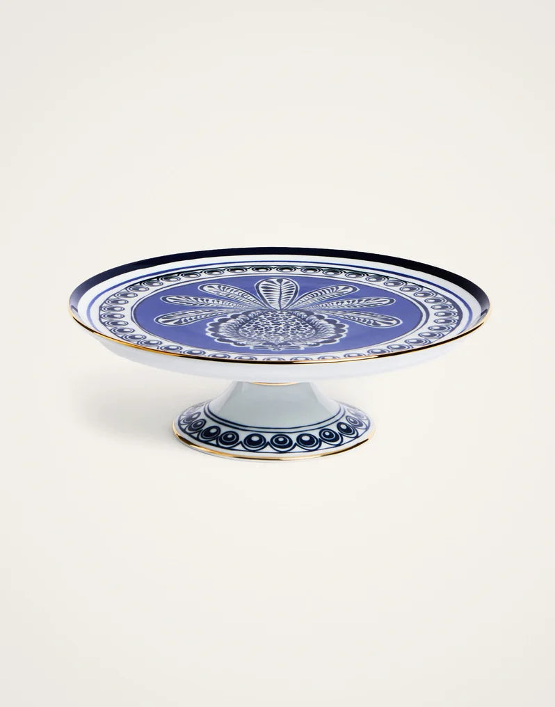 The Porcelain Pineapple Blue Cake Stand by La Double J is a joyful celebration of Italian craftsmanship and maximalist style. Handcrafted in Verona, Italy, from 100% fine porcelain, this vibrant piece is adorned with the brand’s signature Big Pineapple print—playful, bold, and unmistakably La Double J. The eye-catching design is elevated by delicate, hand-painted 18K gold trim, adding a luxurious finish to this already statement-making serveware.