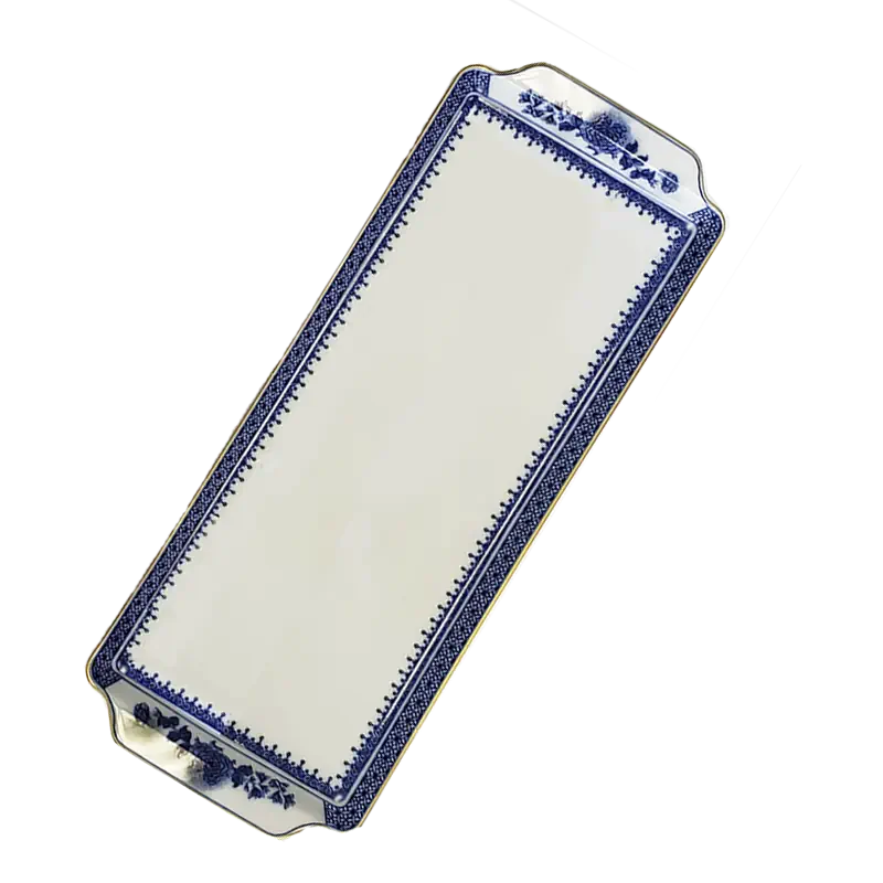 MOTTAHEDEH SANDWICH TRAY brings both functionality and style to the table. The porcelain design is further complemented with 22-carat gold edging, adding a touch of sophistication. The dishwasher-safe feature increases its practicality for multiple serving purposes. The Apple Green Lace Tray (S1373) is part of the Lace family and comes with intricate designs in varying colors. It's perfect for appetizers, desserts, cakes, and even vegetables. The Blue Canton Tray (HC173) is microwavable and dishwasher safe, ideal for a variety of uses. The Cornflower Lace Tray (S1473) is similar to the Apple Green Lace, with varied colors and intricate details. Lastly, the Imperial Blue Tray (CW2473) is from the Colonial Williamsburg collection and is a perfect accompaniment for Imperial Blue dinnerware. All trays are made of high-fire porcelain and feature 22