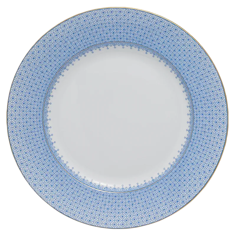 The Cornflower Lace dinner plate can be used with many patterns. Highlighted by bands of 22k gold, this elegant lacey pattern offers both the feel of elaborate decorative detail while also being perceived as a solid design. It coordinates beautifully with other services.