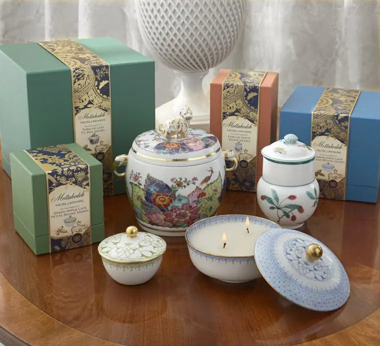 Heirluminare Petite Round Box in Cobalt Blue Lace (Product Code S1663V) offers a unique fragrance of Rose, Ginger & Mandarin Flower with top notes of Bergamot, lemon, and mandarin flower, heart notes of tuberose, jasmine, ginger, and ylang-ylang, and background notes of cedarwood, amber, vanilla, and cinnamon. The 2 oz. candle has an average burn time of 13 hours and is crafted from 100% natural wax with no palm oil, producing a clear and smoke-free burn. It is beautifully packaged for gift giving. The Green Apple Lace Heirluminare Petite Round Box (Product Code S1363V) has a Fresh Lemon Verbena scent, with top notes of Lemon Zest, heart notes of Verbena, and background notes of White Tea. This candle is also 2 oz. and has an average burn time of 13 hours and is crafted from 100% natural wax with no palm oil, producing a clear and smoke-free burn. Both of these candles are presented in elegant round boxes, and they are designed to provide a pleasant fragrance with a long burn time. They would make lovely gifts due to their beautiful packaging.