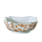 The small Sacred Bird and Butterfly Square Bowl is a unique shape that expresses excellent craftsmanship. Ideal for the dinner table, this bowl can be used to serve up vegetables or fruit. It is part of the famed Chinese export pattern of ca. 1800, featuring traditional motifs of birds, butterflies, and flowers in traditional Chinese orange and gold colors. The Chinese word for butterfly, tieh, conveys the wish for a long, happy life. Historic Charleston offers authentic reproductions of the pattern ca. 1800-1810. This dish is also dishwasher safe.
