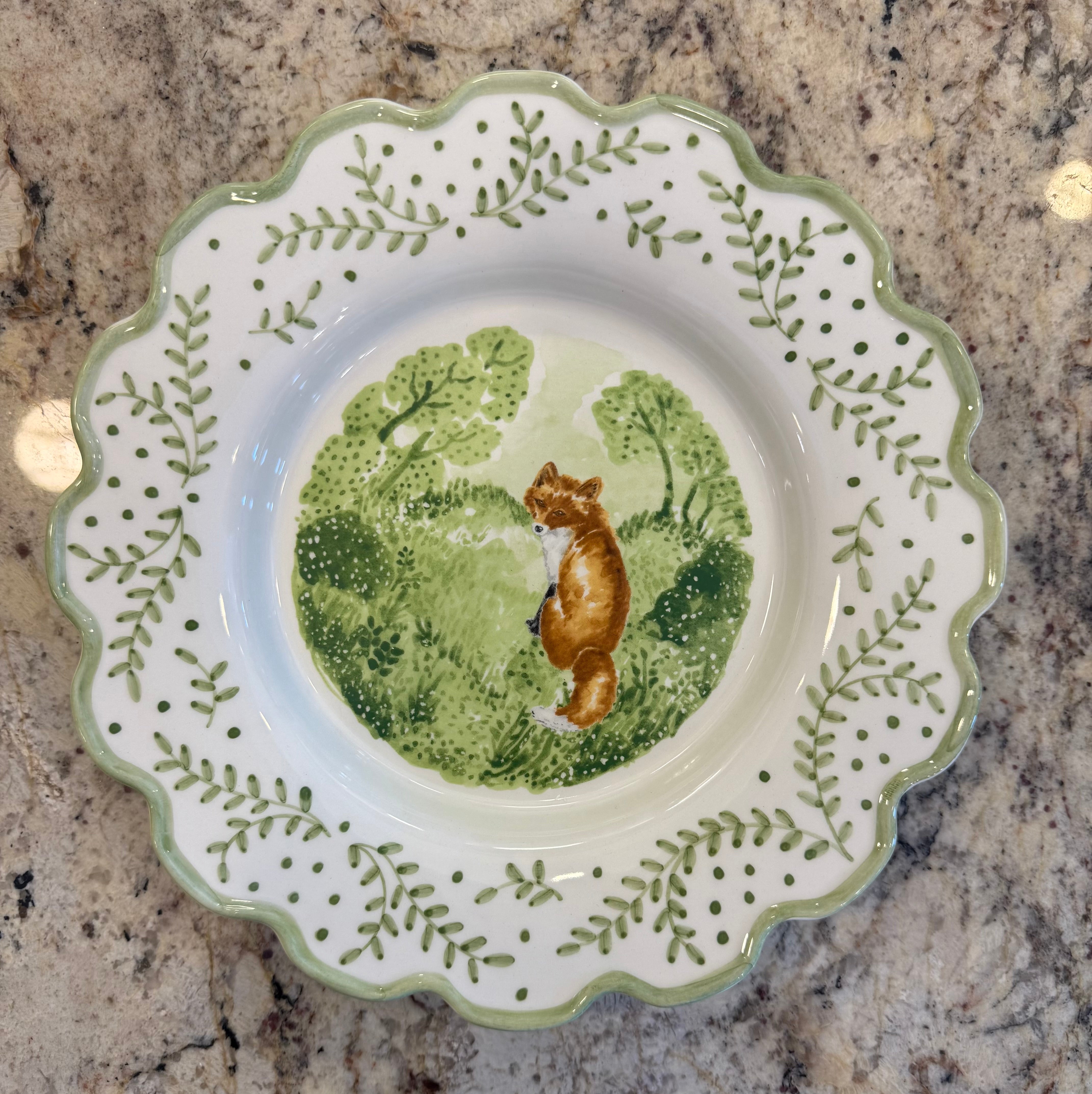 The foxy 10" Scalloped Dinner Plate from CE Corey's collection brings the beauty of nature to your table. Featuring a hand-painted scene of a running hare, the plate blends soothing shades of blues and greens, capturing the grace and motion of the animal. Each piece is meticulously handmade and hand-painted in Portugal by skilled artisans, ensuring each plate is unique.