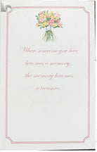 This greeting card package contains a die cut image that is hand glittered and tied with a ribbon to the greeting card which has the same image. Also included is an envelope, all materials are carefully packaged in a cellophane envelope to protect the glitter and card. A copy of the greeting is also included in the back of the cellophane envelope. sympathy card