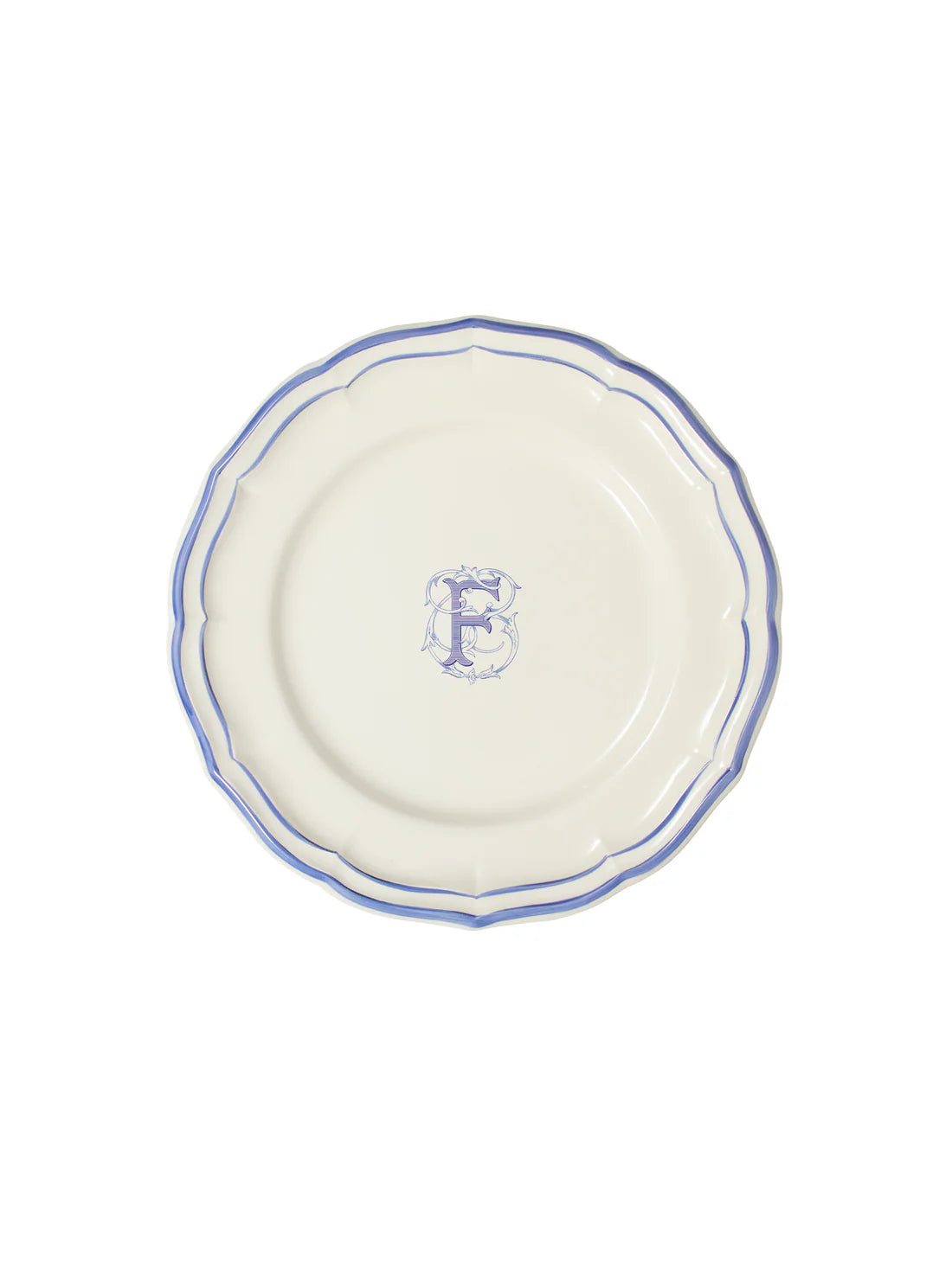 Handcrafted in Gien, France, this 9" dessert plate showcases the timeless appeal of French Faience pottery. Delicate scalloped edges frame a hand-painted design with signature French blue accents, creating an understated elegance that transitions seamlessly from everyday dining to formal occasions. The monogrammed "F" adds a personalized touch to this refined piece. Its classic aesthetic complements other Gien patterns, inviting you to curate a cohesive table setting that honors traditional French craftsmanship while bringing sophisticated charm to your home.