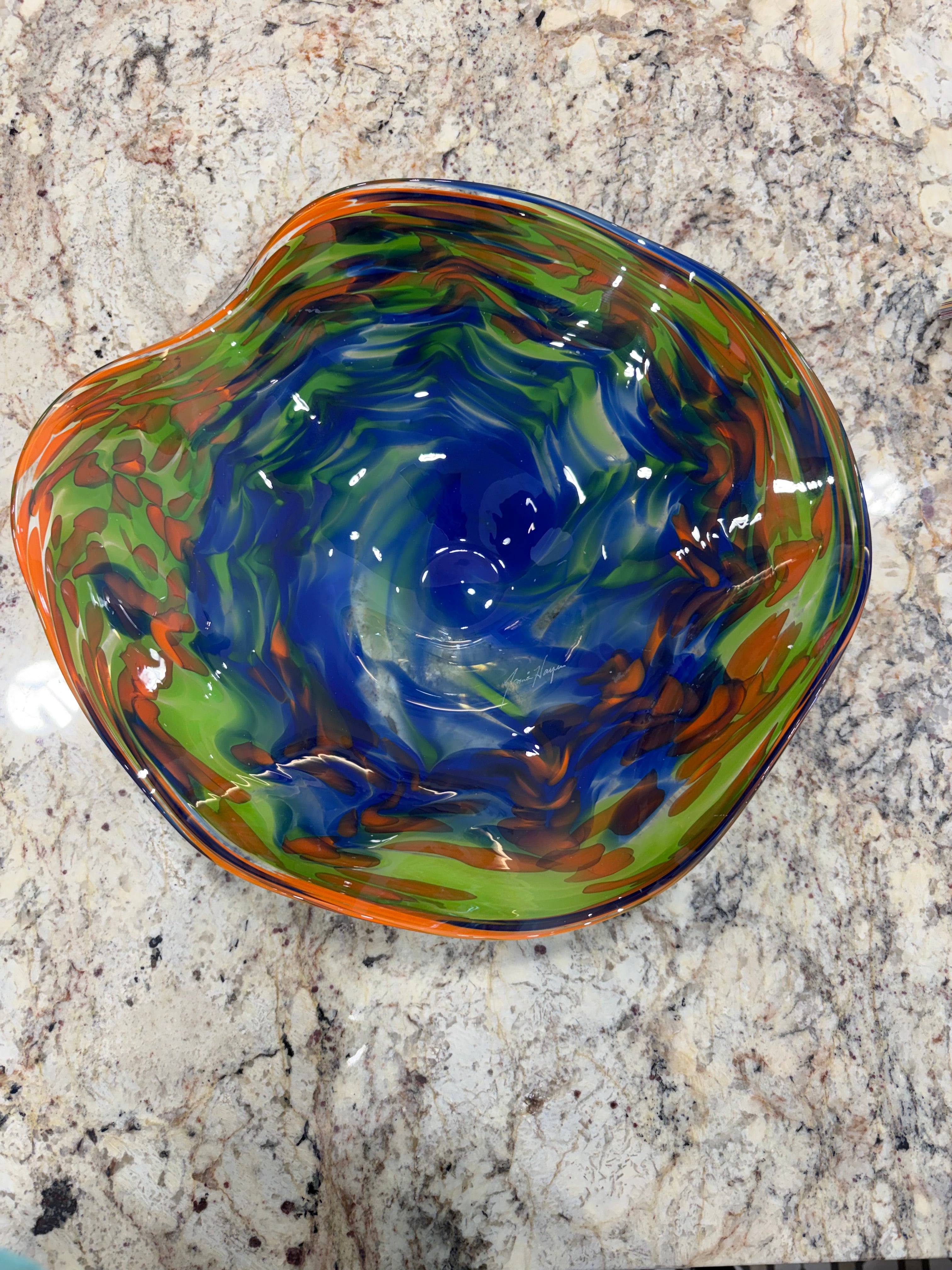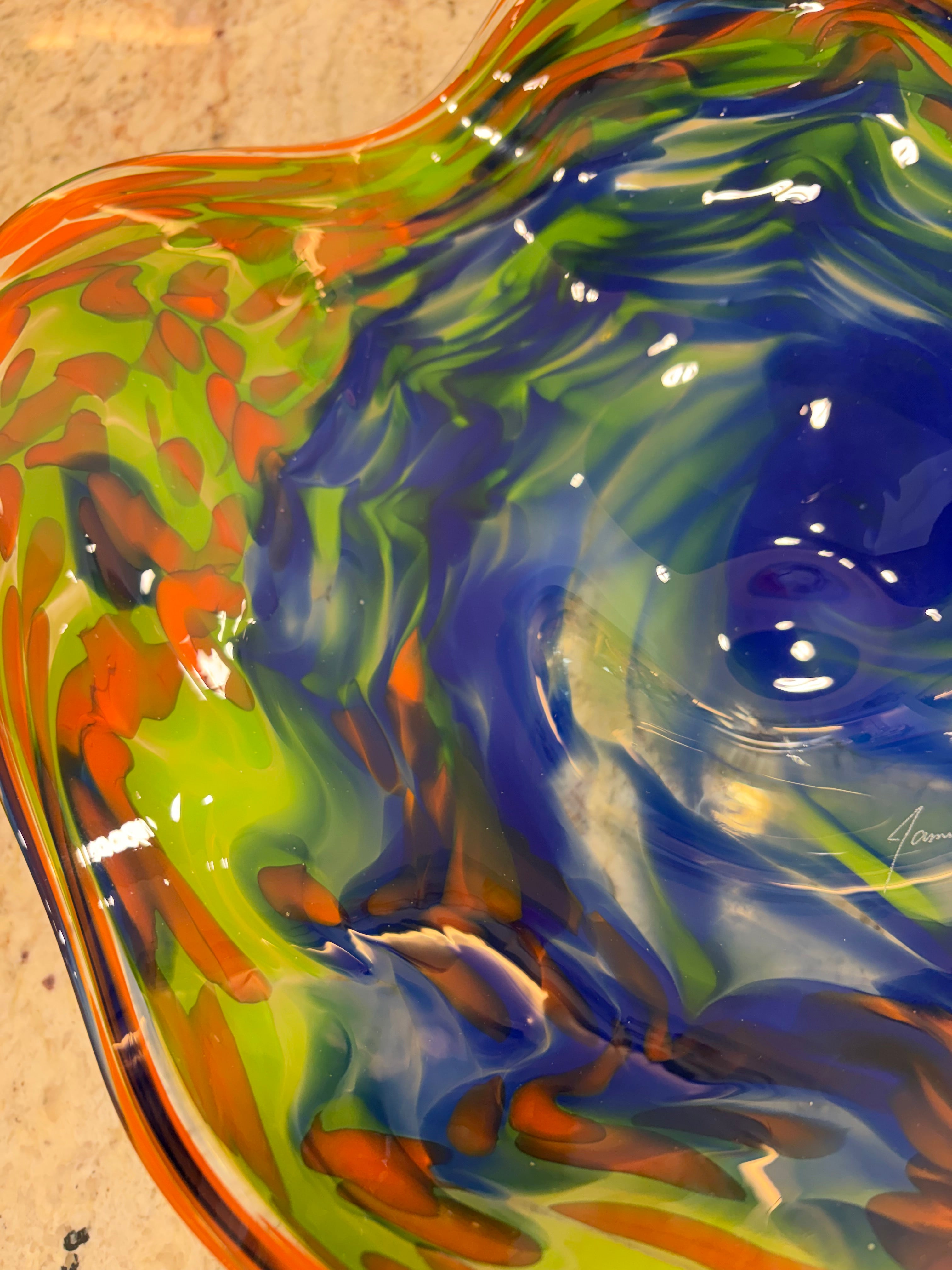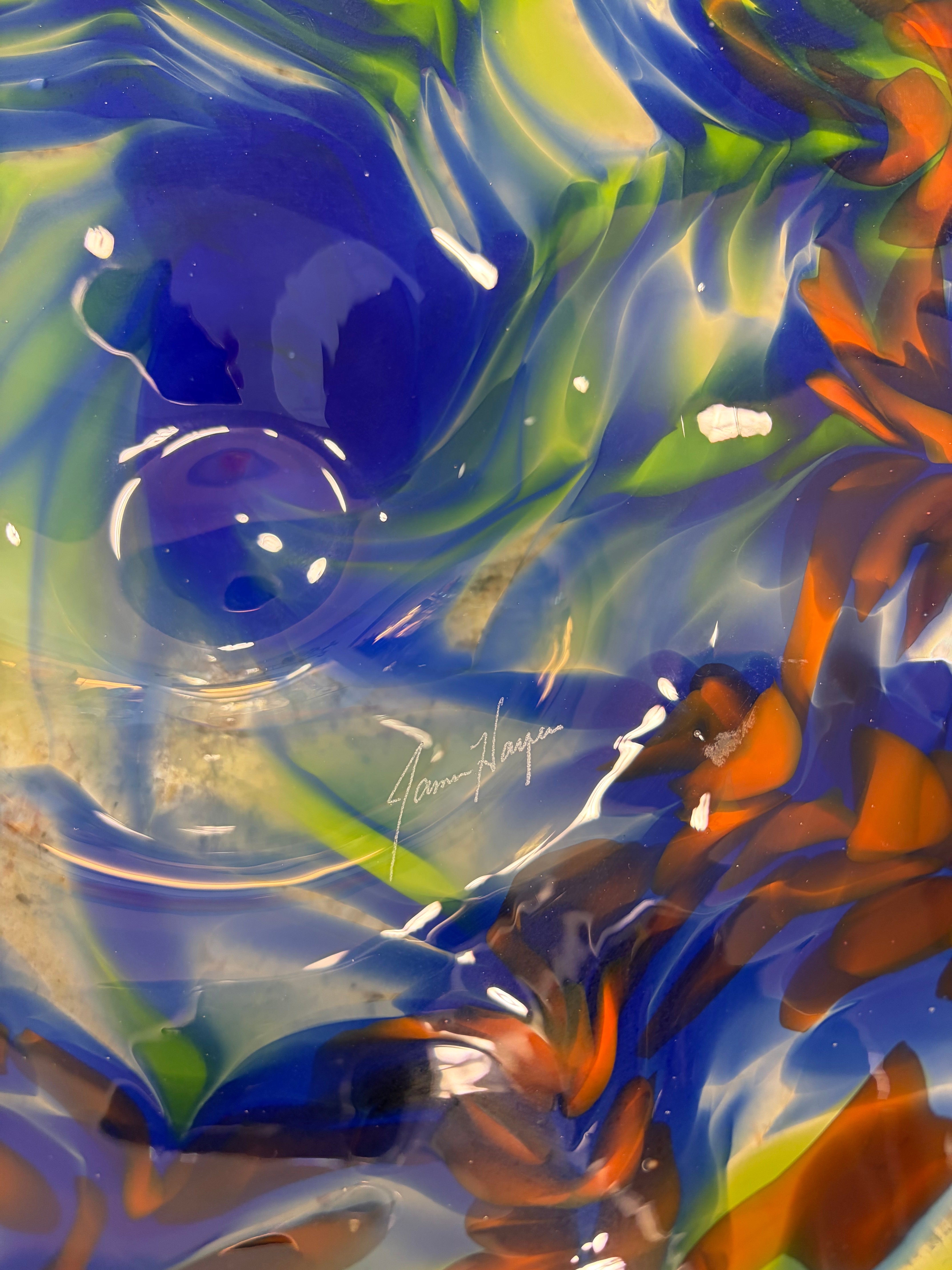 Handblown glass artistry meets functional design in this striking 13" wall bowl by James Hayes. Each piece is individually crafted, capturing the organic beauty of molten glass shaped by skilled hands. The generous curved form creates visual depth and movement on any wall, while its substantial presence commands attention in entryways, living rooms, or galleries. A sophisticated statement piece for collectors who appreciate one-of-a-kind craftsmanship and the subtle variations that make handblown glass truly unique.