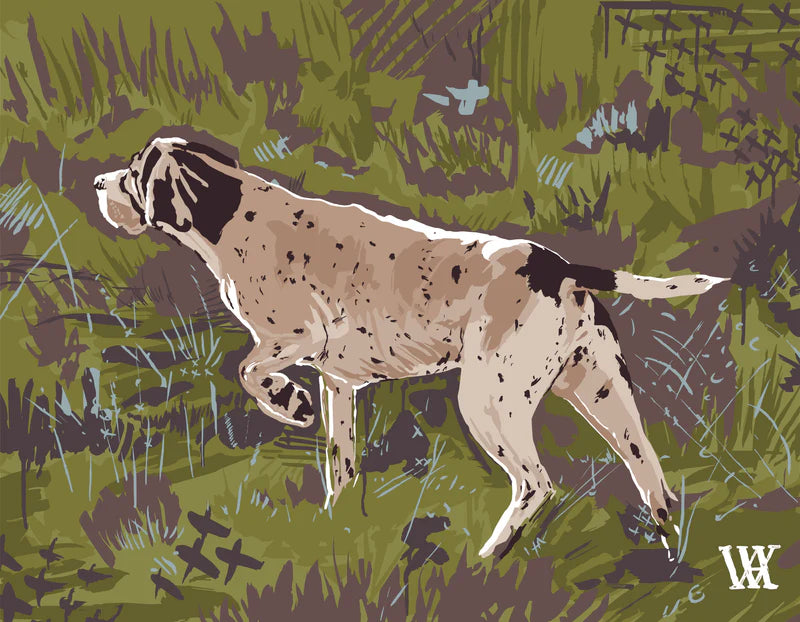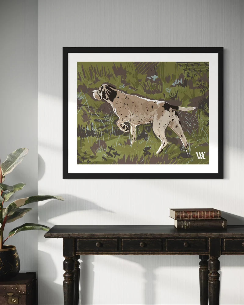 This distinguished art print captures a moment of keen anticipation, depicting an English Pointer in statuesque focus against a landscape rendered in sophisticated olive, cream, and warm earth tones. The artist's expressive brushwork evokes the character of Georgia's Red Hills terrain, celebrating the intersection of field sport tradition, canine excellence, and regional heritage. Ideal for discerning collectors, hunting lodges, professional offices, and those drawn to authentic sporting art that honors both the hunt and the bond between handler and dog.