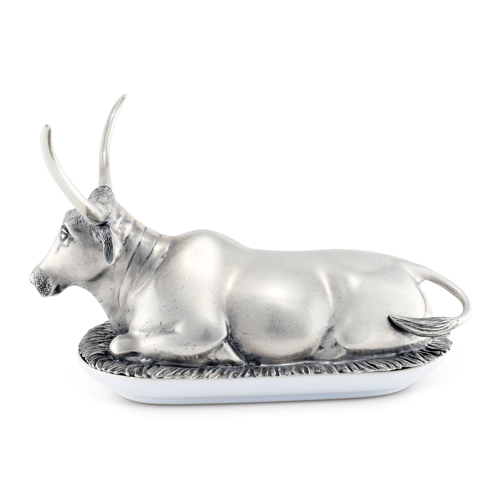 Enrich your hosting experience with this majestic Pewter Longhorn Steer Butter Dish from the Western Frontier Collection. Crafted with intricate design, this dish bestows an astounding 3D Steer pewter lid atop a luxurious stoneware butter plate. Its size suits perfectly to keep your butter fresh, lending a generous space of 8" L x 6" W x 4" T. A splendid blend of utility and aesthetics, this butter dish stands as a unique gift for fans of western, cattle-themed tableware, and for those who love designer stoneware for their western-style entertaining.