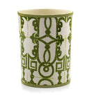 Exceptionally pretty yet highly practical. Features a Grecian style motif in green on fabric with braid trim over wipe-clean plastic. Made in America.